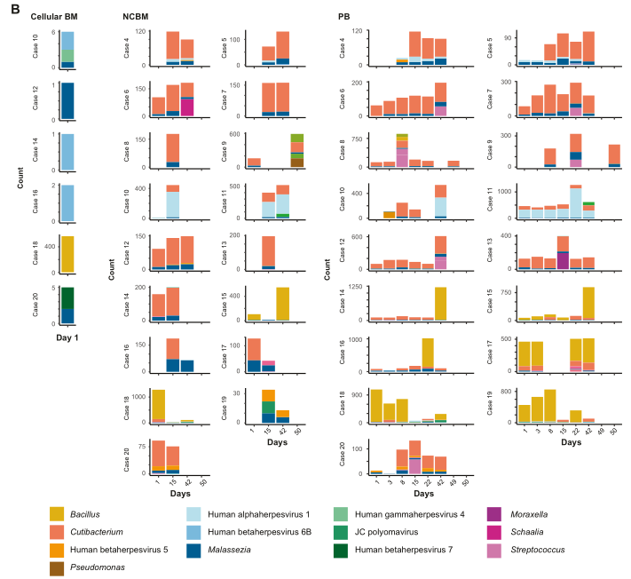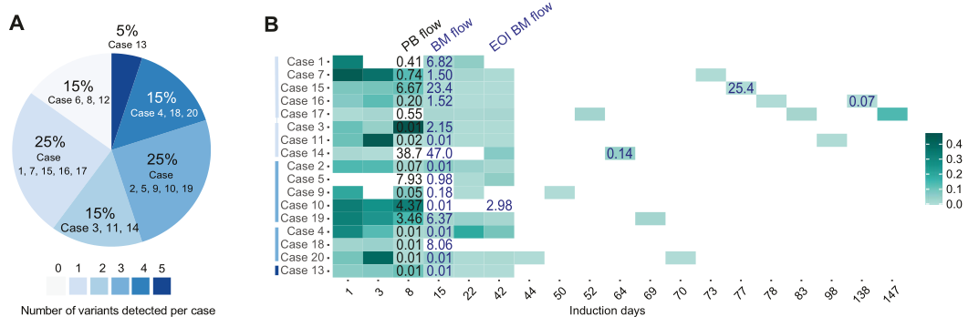 无细胞DNA(cfDNA)测序有望成为一种非侵入性诊断工具,用于评估母婴健康、早期检测癌症和监测治疗反应,以及以识别感染性微生物。急性淋巴母细胞白血病(ALL)是最常见的儿童癌症,尽管在过去50年中预后有显著改善,但仍然是儿童癌症相关发病率和死亡率的主要原因之一。此外,由于当前细胞毒性疗法的免疫抑制和骨髓抑制后果,感染性并发症仍然是治疗相关死亡率的主要原因。 几十年来,血浆中cfDNA的存在已为人们所知。根据DNA测序技术的进展,循环肿瘤DNA(ctDNA)目前正在被评估为恶性肿瘤症状前检测的生物标记物,以及监测反应和指导治疗的工具。迄今为止,大多数研究都是在实体瘤上进行的,其中ctDNA监测越来越显示出诊断和预后价值,有可能改善癌症患者的预后。无细胞RNA测序和核小体印迹显示,造血细胞是健康个体循环核酸库的最大来源,这表明与实体肿瘤相比,ctDNA监测在检测造血源性肿瘤方面可能更为敏感。 血浆中非人类DNA的鉴定和定量也显示出作为诊断传染病和监测人类病毒组的策略的前景。研究表明,微生物cfDNA(mcfDNA)测序能够更快速地检测稀有物种以及通过常规细胞培养方法难以检测的病原体。例如,最近发现,鸟枪式mcfDNA测序可以预测患有癌症的儿童患者即将发生的感染。mcfDNA测序敏感性的提高可以进一步确立微生物测序在诊断和预测感染性并发症方面的临床实用性。提高mcfDNA检测灵敏度的一种策略是丰富微生物特异性序列。 近日,一个以斯坦福为主的团队在 Science advances 杂志上发表了一篇题为“Simultaneous monitoring of disease and microbe dynamics through plasma DNA sequencing in pediatric patients with acute lymphoblastic leukemia”的文章。在本研究中,研究团队试图开发一种方法,同时监测ALL患儿的两个主要死亡原因:(i)疾病持续或复发;(ii)免疫抑制环境中的感染性微生物。为了实现这一点,研究团队开发并评估了一种新的基于捕获的超深测序策略,该策略在接受诱导化疗的ALL患者的血浆中富集了白血病特异性突变和潜在微生物。结果显示,这种方法可以检测和监测大多数患者的白血病,并确定在患者接受治疗时特定的ctDNA动态模式。此外,通过比较细胞与ctDNA变异等位基因组分(VAF),研究团队发现在诊断时进行侵入性骨髓检查以分离恶性细胞对于分析小的基因组变异可能是不必要的,因为在两种样本类型中检测到相似的变异频率相当。 图片来源:Science Advances 研究概述 在临床试验中,共有168份样本接受了测序,这些样本是从20名新诊断ALL患者中前瞻性收集的,他们接受了为期6周的诱导治疗。从外周血(PB)和骨髓中收集细胞和血浆(无细胞)组分,以便比较白血病相关突变和感染性微生物DNA的不同潜在储存库(图A)。panel覆盖率(图B)在目标序列上是均匀的,在12884次读取的平均深度上覆盖了100%的目标区域。 诊断时,平均血浆cfDNA产量与非细胞骨髓(NCBM)cfDNA产量相似(平均值分别为85 ng和75 ng)。在诱导化疗的前几天,血浆cfDNA产量增加,可能是由于开始治疗后白血病细胞迅速死亡所致。NCBM cfDNA产量在第15天达到峰值,这表明骨髓中的细胞仍然以比PB中的白血病细胞更高的速度和更晚的时间点死亡。此后,在整个诱导治疗过程中,cfDNA浓度保持在10 ng/ml左右,而在诱导治疗后期,NCBM cfDNA产量增加(图C),这可能反映了诱导治疗后再生造血细胞的更新。 工作流程、质量控制指标和cfDNA产量。 图片来源:Science Advances 诱导治疗期间VAF突变清除的患者动力学 在20名患者中,有17名患者(85%)在诊断时,ctDNA NGS识别出一种或多种变体(图A)。诱导化疗过程中的突变清除几乎是普遍观察到的。每个患者平均有2.3个可检测的突变(范围为0到5;标准差为1.3)。检测到39个独特突变,只有一个共享突变实例(病例3和16中的KRAS p.G13D)。当患者接受诱导化疗治疗时,观察到不同的变异等位基因清除模式。一般来说,在整个诱导治疗过程中,VAF都会先增加后减少(图B),这与化疗药物的药代动力学和细胞快速死亡一致。在这段时间内,这些基因座的覆盖率保持不变。16例患者中有8例(71%)发现的躯干突变(truncal mutations;定义为NCBM和PB中等位基因频率均大于0.25),包括NOTCH1、NRAS、KRAS、JAK2、NF1和ADGRL2基因。 患者队列中纵向清除率的变异。 图片来源:Science Advances 诱导期间观察到的微生物入侵 研究团队建立了同时检测细胞和cfDNA中病毒、细菌和真菌微生物物种的技术可行性。五名健康对照组和五名诊断为急性髓细胞白血病(AML)的患者的mcfDNA作为对照组。 结果显示,研究团队发现mcfDNA的变化是动态的(图B)。与健康对照样品相比,ALL患者中检测到的主要微生物种类发生了变化。例如,在所有健康样本中都检测到了Ralstonia菌属,但在126份ALL样本中仅一例检测到此菌属。相反,在大多数样本中均检测到Cutibacterium,但在健康对照组中均未检测到表皮细菌,这可能代表共生皮肤细菌入侵人类宿主的能力。在一部分患者中检测到已知的导至ALL患儿死亡的芽孢杆菌Bacillus。对于真菌DNA,60%的健康对照组和17个诊断性所有样本中的13个(82%)检测到Malassezia,但AML样本均未检测到。 诱导期内细胞骨髓、NCBM和PB中的微生物(病毒、细菌和真菌)丰度。图片来源:Science Advances ALL患者诱导治疗期间的动态病毒组 PB诱导治疗期间病毒种类检测的趋势表明,每个病例检测到的病毒种类具有可重复性(图A),并与健康对照组和五个年龄匹配的AML病例进行比较。所有