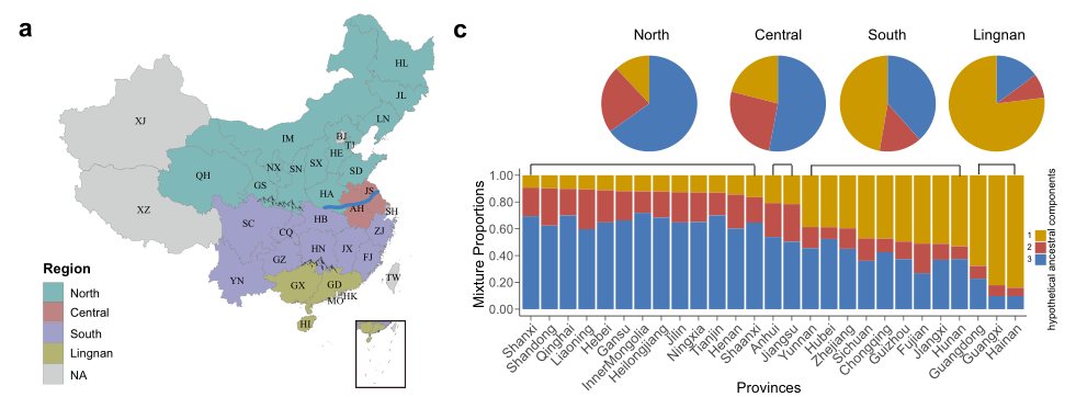 了解人类基因组的结构是实现精准医疗的基本途径。在过去十年中,在解开复杂性状/疾病的遗传基础和人类进化史方面取得了巨大进展。对具有不同祖先的全球人群进行深入分析,可以提高对基因组变异与人类疾病之间关系的理解。然而,基因组研究在全球人口中存在着巨大的不平衡,欧洲血统的个体约占所有全基因组关联研究参与者的79%。同样,大部分全基因组测序(WGS)工作主要针对欧洲人群,如荷兰、英国和冰岛人群。即使在更大的基因组项目中,如由来自80多个不同研究的约155k名参与者组成的TOPMed(Trans-Omics for Precision Medicine)项目,也只有9%的样本是亚洲人后裔。因此,需要大规模的基因组数据来了解亚洲人群的遗传基础。最近,一些研究对包括日本人、韩国人和中国人在内的亚洲人群进行了排序和分析。新加坡SG10K试点项目报告了4810份全基因组测序样本,包括903名马来人、1127名印度人和2780名中国人,GenomeAsia 100K项目的试点研究提供了来自亚洲不同国家1267名个体的数据集。 尽管做出了上述努力,但中国人口在人类基因研究中的代表性仍然不足。中国作为人口最多的国家,是一个多民族国家,其中汉族占人口的90%。全国共有34个行政区划,包括省、市、特别行政区。研究团队之前的研究表明,即使有包含64976个人类单倍型的单倍型参考panel,中国人口的基因型填充也无法达到最高精度,仍然需要一个特定于人口的参考panel。对中国人口的遗传研究有可能使约20%的世界人口受益,并与世界其他地区进行比较。 近日,来自中国的研究团队在杂志Nature communications上发表了一篇题为“Genomic analyses of 10,376 individuals in the Westlake BioBank for Chinese (WBBC) pilot project”的文章。研究团队启动了中国西湖生物银行(WBBC)项目,以在大规模队列中描述基因组变异和群体结构,收集约100000个具有深层表型的样本。本文描述了中国34个行政区中的29个行政区10376个样本的WBBC试点项目的基因组发现。研究团队提供了一个基于中国人群的参考panel,可以显著改善中国人口的基因型填充性能,尤其是对于低频和罕见变异。通过分析WGS数据,研究团队发现SNX29、DNAH1和WDR1基因中存在选择特征,酒精代谢基因的衍生等位基因(ADH1A和ADH1B)大约出现在7000年前,在4000年前的东亚更为常见。遗传证据支持秦岭-淮河线和南岭山脉的相应地理边界,这将汉族划分为不同亚群,同时,研究团队发现北汉族比南汉族更同质。 图片来源:Nature Communications 主要内容 WBBC试点数据集和基因变体。 WBBC试点项目从中华人民共和国34个行政区划中的29个行政区划中抽取了10376人(图a)。研究团队在NovaSeq 6000平台上对4535人进行了WGS。在去除污染和重复样本后,保留了4480个人进行下游分析和统计。平均测序覆盖率为13.9×,覆盖99.77%的基因组。此外,6025名个体通过高密度Infinium Asian Screening Array(ASA)进行了基因分型,其中184名个体也进行了全基因组测序。 研究团队从10396万个原始变异体中筛选出81498995个变异体,包括74118191个单核苷酸变异体(SNV)和7380804个插入和缺失(INDEL)。将WBBC中确定的变体与其他现有数据库进行比较,有45696726个变体在1000基因组计划(1KG)、gnomAD 或UK10K 中不存在(图c),其中绝大多数为罕见变异。 WBBC中样本统计数据。 图片来源:Nature Communications 变体注释和个体基因组。 为了描述这些变体的生物学特征,研究团队使用ANNOVAR工具对4480名个体的所有变体进行了注释。对于未在dbSNPBuild151中的变异,内含子区和基因间区的变异分别占38.31%和51.33%。只有0.98%的变体位于编码和剪接区域(图d)。错义变异体占编码区和剪接区变异体的54.22%,剪接变异体占变异体的29.69%(图e)。 WBBC中变体的统计数据。 图片来源:Nature Communications 基因组单态密度评分分析。 单态密度评分(SDS)可用于推断最近的等位基因频率变化。研究团队试图通过基于4334名全基因组测序结果推断中国汉族人群SNV的最新等位基因频率变化。结果显示在染色体16p上的SNX29基因(图a)中发现了一个重要的选择标记,该基因编码sorting nexin-29蛋白,并在肾脏、淋巴结、卵巢和甲状腺组织中广泛表达。SNX29基因上30多个SNP表现出强烈的选择特征,这表明该基因组区域的选择显著富集。研究团队还确定了其他两个潜在选择信号,3号染色体上DNAH1和在4号染色体上WDR1(图a)。DNAH1基因的多态性显示出与中国男性不育的潜在关联,而WDR1基因的变异是中国人群痛风发生的危险因素。研究团队还确认了其他几个重要自然选择信号,酒精脱氢酶(ADH)基因簇,主要组织相容性复合体(MHC)区域和ALDH2(图a)。这三个选择特征区域也在日本人群中被发现。酒精代谢酶,如ADH基因(包括ADH1A、ADH1B、ADH4、ADH5和ADH6)和乙醛脱氢酶(ALDH2)基因,对酒精代谢途径和随后的酒精中毒保护作用有着有效的影响,这强烈表明了不同种族特定的酒精消费模式。 SDS分析中国汉族人群全基因组近期选择特征。 图片来源:Nature Communications 中国人口基因型填充参考panel。 研究团队评估了中国人群中WBBC、1KG、CONVERGE和两个组合panel(WBBC+EAS和WBBC+1KG)的基因型填充准确性。结果表明,WBBC的中国样本数几乎是1KG项目的15倍,大大改善了低频和罕见变异的填充(图a)。两个组合panel,WBBC+EAS和WBBC+1KG,具有最高的R平方(Rsq)和变体数量,其次是WBBC,1KG和CONVERGE(图a)。总体而言,研究团队采用Rsq和NR等位基因一致率来衡量五个panel的基因型填充准确性。结果