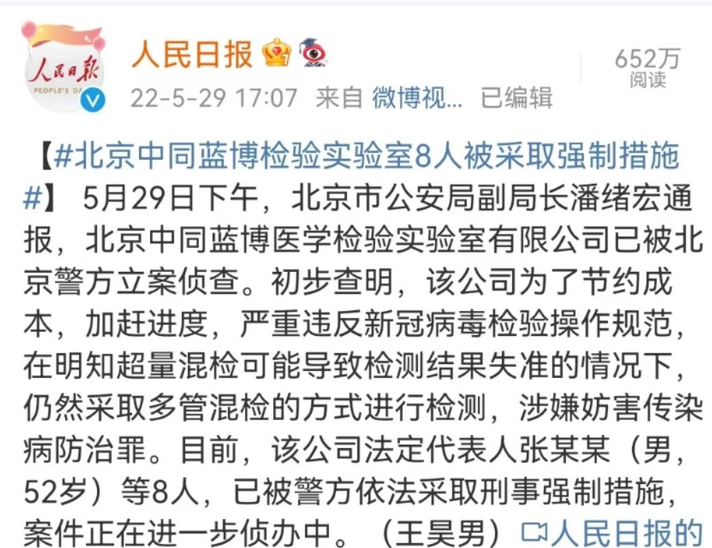 核酸检测造假是一个很严重的事情,如果有阳性被报成阴性,然后放任在人群中自由传播病毒,要不了多长时间他能让一个区的人都被隔离。 而北京市已经连续查出了3家核酸检测公司造假。 5月23日,北京朴石医学涉嫌核酸检测造假,7人被刑拘。 5月27日,北京金准医学涉嫌核酸检测造假,17人被刑拘。 5月29日,北京中同蓝博医学涉嫌核酸检测造假,8人被刑拘。 这三家公司的核酸造假都有一个特性,就是多管混合,把大量样本混一起检测,这会大幅降低核酸检测公司的成本,但也会导至送检标本病毒密度大幅下降,进而导至检测精度大幅下降,从而可能使得部分阳性被检测成阴性。 你说这三家核酸公司故意投毒谈不上,但他们偷工减料的行为一定会导至零星阳性得以隐匿于人群之中,从而导至病毒继续传播。北京在5月份阳性连绵不绝,天天都有十几个阳性蹦出来,始终压不下去,给人一种奥密克戎不可战胜的错觉,和这3家造假的核酸公司有直接因果关系。把这3家公司的负责任都刑拘之后,北京社会面的阳性奇迹般的在几天之内给清零了。不是全民核酸对付不了奥密克戎,是有人故意核酸造假,导至阳性被遗漏在外。这次北京公安动用大量人力物力严查核酸公司,是因为北京市接近一个月连续阳性,疫情始终压制不住,所有医学专家都无法解释这个现象。那其他无疫情或低疫情的城市,如何杜绝核酸公司造假?你像武汉,社会面一个阳性都没有,现在每3天就要做一次核酸,而类似这种城市很多,像这种城市里的核酸检测公司偷工减料,我们怎么发现?如果发现不了,任由他们偷工减料,那我们这么日复一日的动员全民做核酸,意义又是什么呢?花那么多钱做核酸,动员那么多民众做核酸,就是为了以防万一,结果核酸公司反手给你来个检测造假,让你根本防不了这个万一。北京市在5月份疫情最高峰,每日检出的阳性率也仅为十万分之0.5,每20万人里才有一个阳性。这次北京公安调取了核酸检测的原始数据,并对核酸公司进行了刑侦级检查,最终发现了蛛丝马迹。但每家核酸检测公司每天都要完成几十万份样本的检测,产生的检测数据是一个天文数字,因此原始数据通常只会保留一周,超过的直接删除。而像武汉这种,全社会面没有阳性,出一个阳性都是惊天动地的事情。每天送来的几十万份样本,除了阴性就是阴性,全是阴。其实就算我不检测,直接报阴性,一时半会也没人能发现。敢于造假的主要原因是他们笃定自己不会被发现,而不是因为惩罚有多严厉。当年监管不严时,连给小孩子吃的廉价零食,几毛钱一袋的东西都有人敢造假,利润低危害大惩罚严,敢造假就是因为造假者笃定自己不会被抓。假设核酸检测造假的被抓率只有万分之一,一万个人这么干只有一个被逮到,那你把惩罚提升至死刑都不可能阻挡他们去造假。不仅如此,正经做检测的人很快就会破产,因为劣币驱除良币,剩下的全是造假者。这是必然会发生的事情,概率为100%,没有任何其他可能。所以重点是要提升抓住造假被发现的概率,这个才是威慑造假者的核心。这次北京市能发现3家公司核酸造假,是因为北京公安动用了大量人力物力,专门去办这个事。我绝对不相信其他核酸检测公司都是清白的,全中国就3家核酸公司造假且全部恰巧集中在了北京,其他地区没发现只能说明没人去查,肯定有人在里面滥竽充数。6月9日,北京市宣布每月对核酸检测公司进行一次盲样考核,不合格的停止核酸检测工作,整改合格后才允许继续营业。简单的说,我不去查你们这些核酸检测公司的业务和数据了,太多,查不过来,我不查了。但是,我每个月会随机选一天,在给你检测的样本里,偷偷塞几管我自己在别的地方采的样本,比如说在外国人入境隔离点,这几管样本的编号我备案留底。在给你之前,这几管样本采集自哪些人,这些人是阴是阳,我是提前检测过的,心里有数。偷偷塞给你的这5管,都是阳,但你不知道是哪5管,我知道。等第二天出检测结果,你其他几十万份检测结果我根本就不看,只看这5管样本,看看你有没有测出他们是阳性。如果你上报这5管都是阳,那好,你过关了,下个月我接着过来继续来一次这个流程。那不好意思,你得给我好好解释解释为什么漏了1管阳性。你到底是故意的,还是水平不够,这都不重要,我也不关心这个。无论是什么原因,都代表你没有能力和资格再接核酸检测业务了,你们的检测精度不够。先停业,再好好整改,什么时候整改到我认为你重新具备了核酸检测能力,什么时候再说吧。核酸检测就是在赚快钱,黄金赚钱时间就那么一点点,一旦疫情消退就没什么业务了,因此被停业基本就代表宣判死刑了,业务会迅速被其他有资质的公司抢走。监管成本非常低,一个人就可以监管全北京所有核酸检测公司,而且可能只是顺手监管,但监管精度非常高,只要核酸检测公司稍有懈怠就有可能被摘除牌照。在以前,没人想过核酸检测公司居然敢造假,因为有刑法管着,敢核酸造假必定刑拘。但真有人吃了熊心豹子胆去造假,且数量不少,要钱不要命的人实在太多。在短短几天时间里,就想到了如此简单粗暴但异常高效的方式,真的是厉害。全国其他城市和地区,都应该立即推行这种制度,覆盖所有核酸检测公司。盲样送检,一个月随机查一次,也就是你本月负责的上千万份样本里会在某一天偷偷出现几管阳性,但你根本不知道是哪一管。查出来这