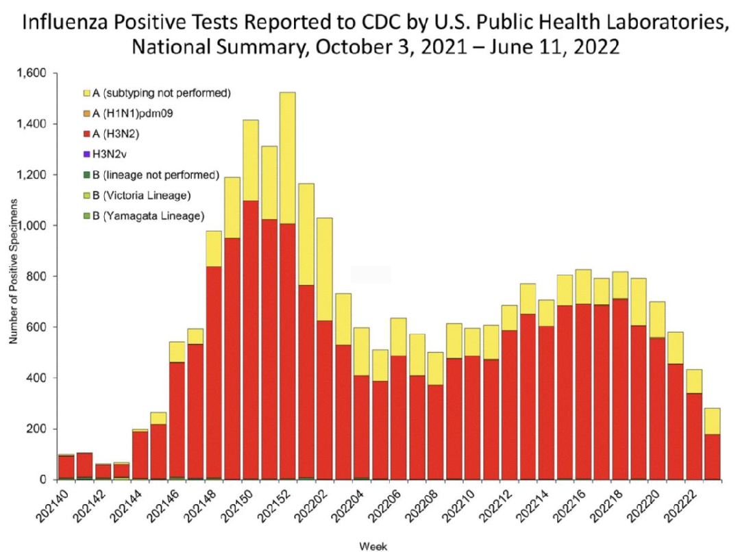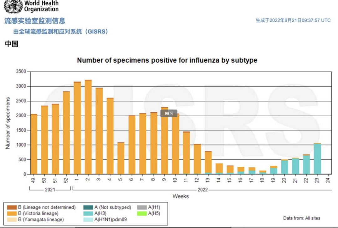 (4)2022年上半年,我国北方甲型流感H3N2的感染基本稳定且病例少,北方感染病例主要是B-Victoria,而且从四月份以来,北方B-Victoria感染病例逐渐降低,5月至今流感阳性率为0-2%。