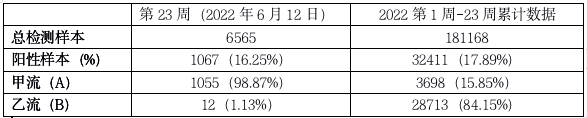 全国临床实验室进行的测试结果总结如下。2022年上半年我国流感阳性率为17.89%,而甲流阳性率为15.85%,乙流阳性率为84.15% 。从总数据来看,上半年乙流占主导地位,但近期我国甲流(A)阳性率逐渐升高,特别是2022年第23周(6月5日-6月12日)我国流感病毒阳性病例几乎都是甲流(98.87%)。