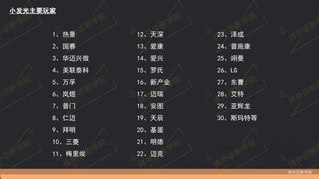 从免疫荧光POCT到单人份半自动POCT化学发光,再到全自动小型化学发光,市场一直在进化... 小发光由日本三菱的PATHFAST开创,2017年前后,单人份小发光开始兴起,彼时的POCT市场上百家厂家开始把POCT带向红海。 此后,国家分级诊疗、医联体、医供体、结果互认开始推行,患者回流的红利让大家对小发光未来替代乡镇市场免疫免疫POCT趋之若鹜,小发光市场的大战也开始打响。 图源:体外诊断学院第十九期会员沙龙 排名不分先后