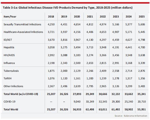 据Kalorama Information的一份关于传染病诊断全球市场分析报告显示,2021年,全球对传染病检测产品的需求总计为625亿美元,其中超过332亿美元来自COVID-19检测。 预计到2031年,试剂、检测试剂盒和耗材检测的全球需求将接近457亿美元,较2018年平均年增长4.7%。 调研报告显示,全球对传染病检测产品的需求将与整个全球IVD市场同等的速度增 长。除COVID-19检测外,传染病仍将是IVD行业的很大部分,占未来10年年收入的38%以上。 增长机会:传染病IVD产品的全球最快增长机会将在性传播感染、医疗保健相关感染、乙型肝炎、丙型肝炎、流感和真菌感染的分子检测中发展;以及对医疗保健相关感染、乙型和丙型肝炎、流感和结核病的快速免疫分析。POC检测将在近患环境中是增长最快的,但在数量上将继续远远落后于实验室检测。 成熟市场:性传播感染、艾滋病和TORCH相关的微生物检测和免疫分析仍将是主流收入来源,但随着潜在患者基础的扩张放缓,需求增长相对较慢。随着疫苗接种和掩蔽活动的增加,新病例数量的减少,全球COVID-19检测市场将下降到可忽略不计的水平。 竞争对手:罗氏、生物梅里埃、雅培、丹纳赫、BD、索灵、伯乐、Hologic、Quidel、赛默飞等是传染病检测产品和技术的全球市场领导者。 地理市场:基于高水平的国家卫生支出和患者活动,以及私人医疗提供者在美国医疗保健系统中发挥的巨大作用。美国将继续是最大和最多样化的传染病检测市场。中国、印度和墨西哥将是发展中经济体中最显著的国家,预计将大幅扩大诊断能力,使传染病检测产品的快速增长远高于平均水平。 发病率、流行率和死亡率:性传播感染(sti)和疟疾占新感染和现有感染的数量最大,而脓毒症、结核病和肝炎造成的死亡人数最多。 0 传染病检测细分领域 传染病IVD检测由试剂、检测试剂盒和耗材组成,可在手工或在自动免疫分析、分子或常规微生物仪器上进行。预计到2031年,全球对这些测试的总需求将略高于457亿美元,较2018年平均年增长4.7%。 在世界范围内,最畅销的传染病IVD检测的应用包括: