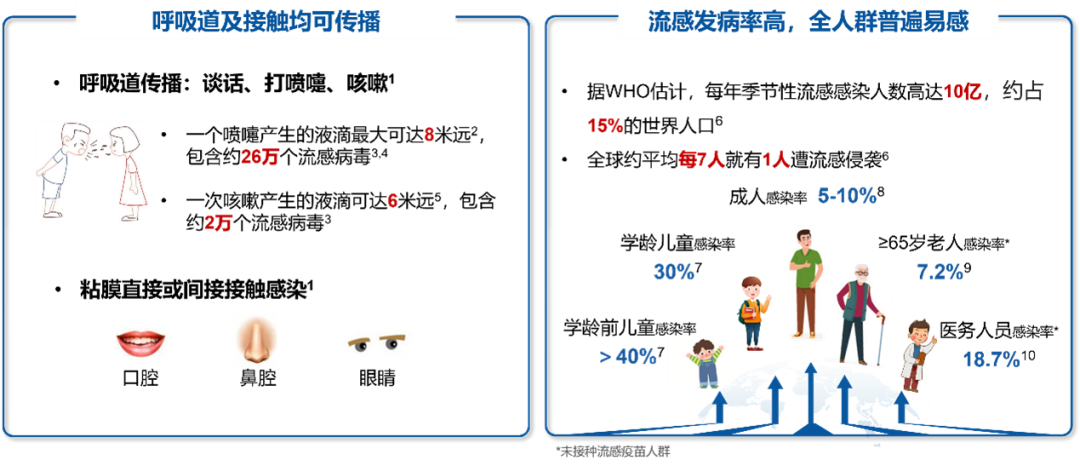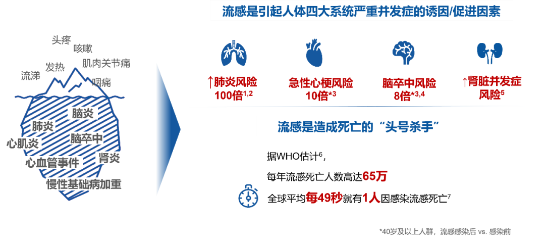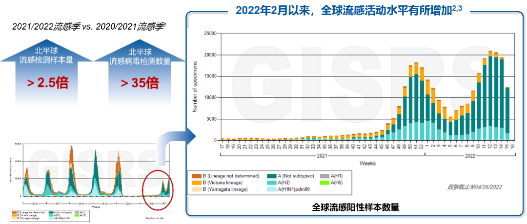 大家对流感的认知是否还停留在2020年,认为流感仍处于低流行水平?实际上并非如此,流感已逐渐恢复“元气”,重新回归到新冠肺炎疫情发生之前的季节性流感流行状态。今年流感疫情形势如何?且看6.11日落幕由中华预防医学会主办的“2022季节性流感防控策略学术交流会”上,来自中国疾控中心专家的解读。最新流感监测报告显示,今年流感活动较上一年有所上升。全球范围内,2022年2月以来,流感活动水平有所增加,3月出现流感流行的高峰,以A(H3N2)亚型为主(图1)。我国南方省份近期流感样病例呈快速上升趋势,尤其是近两周流感样病例已超过前3年的同期,以近98%的A(H3N2)亚型为绝对优势(图2),并引起多起聚集性暴发疫情,主要以中、小学为主。这些数据提示我们新冠肺炎疫情下需重视流感防控。图2 2022年南/北方省份流感样病例标本季节性流感病毒检测结果全球多地区出现新冠、流感共同流行的情况,尤以东南亚地区为典型(图3)。一项几乎汇总了全球所有流感和新冠共感染数据的Meta分析也证实,流感和新冠共感染是存在的,虽然这一比例相对较低,值得关注的是儿童共感染比例要显著高于成年患者,而一旦儿童合并感染可能会导至更严重的结局。这也意味着我们今年仍然面临新冠与流感共同感染的风险,需要加强联防联控。 新冠肺炎疫情发生以来,长期佩戴口罩、限制社交距离等非药物干预措施虽然一定程度上减少了流感病毒传播,使得人群感染流感的机会减少,但也会造成人群对流感的预存免疫力下降,流感易感性增加。我国流感疫苗接种率极低,整体人群接种率不足5%。在这种情况下,一旦进入秋冬流感季,人群重新暴露于流感病毒时易感染流感,将大大增加流感暴发的风险(图4)。图4 新冠肺炎疫情下人群预存免疫力和流感暴发的关系事实上,新冠肺炎疫情发生前,流感的疾病负担就已非常严重(图5和图6)。流感通过呼吸道及接触即可传播,全人群普遍易感。全球每年季节性流感感染人数高达10亿,约平均每7人就有1人遭流感侵袭,其中儿童、医务人员等高危人群感染率更高。流感对中枢神经、心血管、呼吸及泌尿四大系统都可能产生严重并发症,使得肺炎、急性心梗、脑卒中、肾脏并发症等高致死疾病的发病率呈几倍到100倍地增加。据WHO估计,每年因流感死亡的人数高达65万,相当于每49秒就有一人死于流感。这些数据再次提醒我们流感的致命性威胁不容小觑。新冠与流感的交叉流行还会带来叠加效应负担。据报告,流感病毒可在新冠重症患者中诱发较早、较严重的细胞因子风暴,导至休克、急性呼吸窘迫综合征、暴发性心肌炎、急性肾损伤或多器官功能衰竭等严重并发症。最新研究表明,同时感染流感和新冠的患者需要呼吸机治疗的风险是单独感染新冠患者的4.14倍,死亡风险是单独感染新冠患者的2.35倍。这意味着一旦合并感染流感和新冠将增加重症和死亡风险。三、中国疾控专家提醒:尽早接种流感疫苗,未雨绸缪2022流感季当前的流感监测数据和流感预测模型都提示今年秋冬季可能面临流感暴发风险,一旦同时感染新冠与流感,危害可能会很大。为此,中国疾控专家建议,在今年疫苗可及的情况下,尽早接种流感疫苗,以更好地应对秋冬不确定的流感形势,最大程度保护自己、保护家人。