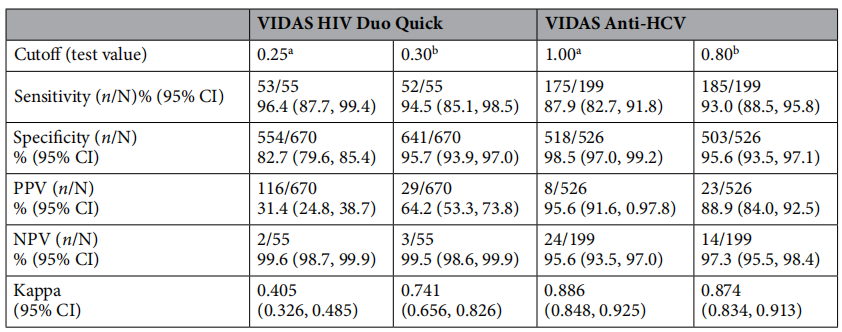 人类免疫缺陷病毒(HIV)和丙型肝炎病毒(HCV)感染仍然是全球重要的公共卫生问题。根据联合国艾滋病毒/艾滋病联合规划署(UNAIDS)和世界卫生组织(WHO)的估计,2020年约有150万人新感染艾滋病毒和丙型肝炎病毒。重点人群,尤其是在注射药物的人群中HIV和HCV合并感染的流行率也令人担忧。在高效抗逆转录病毒疗法(ART)和直接作用抗病毒药物(DAA)的帮助下,已制定了2030年消除艾滋病毒和丙型肝炎病毒(HIV和HCV)作为公共卫生威胁的宏伟目标。UNAIDS 95-95-95目标规定,95%的艾滋病毒感染者(PLWH)应了解其艾滋病毒状况,95%了解其状况的人应接受治疗,95%接受艾滋病毒治疗的人应受到病毒抑制。同样,世界卫生组织建议,目标是在符合条件的人群中治疗80%的丙型肝炎病毒感染,将丙型肝炎病毒感染的新发病率降低90%,并将肝脏相关死亡率降低65%。这些消除目标的进展可以通过行为和生物血清学监测系统进行监测,但它们需要准确的血清学检测来检测艾滋病毒和丙型肝炎病毒抗体。血清学检测还应与干血点(DBS)样本兼容,以减少生物样本采集的结构和地理障碍,促进监测的实施。 VIDAS HIV Duo-Quick是第四代酶联荧光分析(ELFA),能够检测p24抗原和HIV抗体。VIDAS anti-HCV是第三代ELFA,利用NS3、NS4A和NS4B抗原检测抗HCV抗体。这两种分析均作为包含所有必要试剂的ready-to-use试纸出售,VIDAS台式免疫分析仪自动执行方案(即清洗、培养和检测),从而最大限度地减少操作员错误。与手动96孔板血清学分析相比,VIDAS系统操作更简单,成本显著低于其他商业免疫分析仪,如Abbott Alinity或Bio-Rad BioPlex 2200。VIDAS HIV Duo Quick和anti-HCV在血清和血浆中表现出色,但目前缺乏DBS的表现数据,尤其是在血清监测方面。 近日,来自加拿大的研究团队在杂志Scientific reports上发表了一篇题为“Evaluation of the bioMérieux VIDAS HIV Duo Quick and Anti-HCV assays for dried blood spot based serosurveillance”的文章。在文章中,研究团队评估了VIDAS-HIV Duo Quick和anti-HCV检测在DBS中分别检测HIV和HCV抗体的性能,以进行血清监测。分析是根据在乌克兰收集的DBS样本(n=725)子集进行评估。使用Avioq HIV-1 Microelisa System或Ortho HCV v3.0 ELISA Test System作为参考试验,评估敏感性、特异性、阳性预测值和阴性预测值。 图片来源:Scientific reports 主要内容 1. VIDAS HIV Duo Quick 检测DBS样本中HIV抗体的性能统计 选择DBS样本的随机子集(n=725),用VIDAS HIV Duo Quick和anti-HCV分析进行回顾性测试,以评估其性能。 使用Avioq HIV-1 Microelisa System或Ortho HCV v3.0 ELISA Test System作为参考试验,评估敏感性、特异性、阳性预测值和阴性预测值。这两种参考测试都是加拿大公共卫生局行为和生物监测系统的核心,该系统使用DBS样本监测加拿大关键人群中的艾滋病毒和丙型肝炎流行率。 在该子集中,Avioq HIV-1 Microelisa System和Ortho v3.0 ELISA Test System在DBS样本中分别为7.6%(55/725)和27.4%(199/725)。在HIV阳性和HIV阴性的DBS样本中,VIDAS HIV Duo Quick阳性率为96.4%(53/55),阴性率为82.7%(554/670),敏感性为96.4%(95% CI 87.7%,99.4%),特异性为82.7%(95% CI 79.6%,85.4%),PPV为31.4%(95% CI 24.8%,38.7%),NPV为99.6%(95% CI 98.7%,99.9%)。VIDAS HIV Duo Quick与基于kappa系数的Avioq HIV-1 Microelisa System的一致性为moderate (kappa=0.405 [95% CI 0.326,0.485])。 VIDAS HIV Duo Quick和Anti-HCV检测DBS样本中HIV和HCV抗体的性能统计图片来源:Scientific reports 2. Anti-HCV检测DBS样本中HCV抗体的性能统计 在HCV阳性和HCV阴性的DBS样本中,VIDAS抗HCV阳性率为87.9%(175/199),阴性率为98.5%(518/526),其敏感性分别为95.6%(95% CI 91.6%,97.8%),特异性为95.6%(95% CI 93.5%,97.0%),PPV为95.6%(95% CI 91.6%,97.8%),NPV为95.6%(95% CI 93.5%,97.0%)。VIDAS anti-HCV与 Ortho HCV v3.0 ELISA Test System检测结果几乎完全一致(kappa=0.886 [95% CI 0.848,0.925])。 3. VIDAS HIV Duo Quick和 anti-HCV可以充分区分阳性和阴性DBS VIDAS HIV Duo Quick可以充分区分HIV阳性和HIV阴性DBS。此外,ROC曲线分析表明,可以通过调整制造商提供的cutoff值来提高性能。调整测试值显著提高了特异性(95.7% [95% CI 93.9%,97.0%] VS. 82.7%[95% CI 79.6%,85.4%]),并与Avioq HIV-1 Microelisa System一致性提高(0.741[95% CI 0.656,0.826] VS. 0.405[95% CI 0.326,0.485])。 VIDAS anti-HCV也可以充分区分HCV阳性和HCV阴性的DBS,然而,调整测试值cutoff对性能没有显著影响。 DBS样本的VIDAS HIV Duo Quick和anti-HCV性能。 图片来源:Scientific reports 4. 总结与讨论 血清监测将在当地和国际上发挥核心作用,监测在2030年消除艾滋病毒和丙型肝炎目标方面取得的进展。虽然血清和血浆通常是血清学监测的首选生物样本,但由于缺乏基础设施、缺乏训练有素的医务人员以及不方便进入采集点,采集血液并不总是方便或可能的。血清学检测也应可以使用DBS样本,这可能导至更具代表性的抽样和疾病流行率的准确估计。 虽然研究结果表明,由于PPV为64.2%(95% CI 53.3%,73.8%),VIDAS Duo-Quick在低发病率环境中的使用可能有限,但优化DBS样本的洗脱方案可能有助于更好的分析性能。未来的工作将包括使用由高度特征化的参考血清/血浆样本设计的DBS样本改进洗脱方案。 相比之下,VIDAS anti-HCV在实验室的表现更好。尽管如此,但改进DBS洗脱方案对于提高性能和在低发病率环境下使用VIDAS anti-HCV可能是必要的。 |