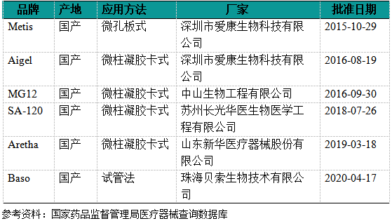 血型检测试剂,主要是指可单独使用或与血型分析仪配套使用的试剂、试剂盒等,属于体外诊断试剂行业中的一个细分领域。血型检测试剂主要分为ABO正反定型血型检测、Rh(D)血型检测、不规则抗体检测、抗人球蛋白检测及血小板抗体检测等试剂。在临床输血试验中,Rh血型系统的重要性仅次于ABO血型系统,Rh血型系统中,RhD抗原性最强,是引起临床输血不良反应的主要因素,因此,输血前对Rh血型进行筛查非常必要。RhC、c、E、e抗原是Rh血型系统除RhD抗原以外的几种具有显著临床意义的抗原,其检测方法与RhD抗原检测基本相同。抗人球蛋白法是鉴定不规则抗体最可靠的方法,也是目前抗体鉴定和交叉配血的“金标准”。血小板表面含有HLA和HPA等抗原,因此对血小板表面的HLA和HPA抗原检测也具有重要的临床意义。血型检测试剂主要包括ABO检测红细胞、抗A(抗B或抗D)血型定型试剂、不规则抗体筛查红细胞、ABO血型正反定卡、Rh血型检测卡、抗人球蛋白检测卡、红细胞交叉配血试剂盒等。无论是微孔板式还是微柱凝胶卡式分析方法,均需要在载体介质中添加特异性血型抗体(如抗A、抗B、抗D试剂)与红细胞等试剂,在一定程度上,特异性血型抗体与红细胞等试剂的质量及稳定性将直接影响检测结果的准确性,因此血型检测试剂作为全自动血型分析仪配套产品,对血型检测试验同样具有重要意义。微柱凝胶卡技术已广泛应用于血型检测中,该试剂卡已将各类血型抗体加入到凝胶中,检测时只需将样本加入后便可实现定型,该技术灵敏度高、易于标准化并易于观察及保存,已成为临床ABO、Rh(D)血型检测及交叉配血的首选检测方法。