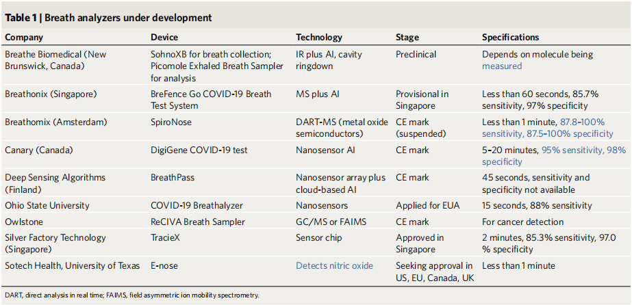 近日,杂志Nature biotechnology上发表了一篇题为“Diagnostics to take your breath away”的文章,在文章中,作者对呼气测试的发展历程进行了阐述,并且美国食品和药物管理局(FDA)宣布了首次紧急使用授权(EUA),用于InspectIR Systems的2019冠状病毒疾病呼气分析仪检测呼吸中的COVID-19,这对整个领域来说都是一个激动人心的时刻,因为每个人都看到了呼气测试快速诊断的前景。 图片来源:Nature biotechnology InspectIR 获FDA紧急使用授权 与其做鼻拭子,不如想象一下做一个简单的2019冠状病毒疾病呼气测试。自大流行开始以来,一直在努力寻找呼出气中SARS-CoV-2感染的化学特征。4月14日,美国食品和药物管理局(FDA)宣布了首次紧急使用授权(EUA),用于检测呼吸中的COVID-19;根据提交给FDA的研究数据,InspectIR Systems公司的2019冠状病毒疾病呼气分析仪的灵敏度和特异性可与金标准PCR检测相媲美。 InspectIR与其他一些正在开发的呼气测试设备一起,其中一些已经通过了监管机构的审查(见下表)。分子识别和检测的进步,加上计算机算法和人工智能(AI)的改进,使这些设备更接近于从呼出物中识别数千种有机化合物的目标。 但该领域需要一种在多种环境和人群中工作的可靠设备,以获得广泛的商业应用。2021,总部位于阿姆斯特丹的Breathomix的SpiroNose的市场投放在不到一周的时间后暂停,因为该设备错过了25例2019冠状病毒疾病阳性病例。 即使如此,这对整个领域来说都是一个激动人心的时刻,因为每个人都看到了快速诊断的前景。 正在开发的呼吸分析仪。图片来源:Nature biotechnology 嗅出疾病 我们每天平均呼吸22000次。离开我们肺部的大部分是大气气体:氧气、二氧化碳和氮气。但是,这种空气的一小部分——不到1%——由称为挥发性有机化合物(VOCs)的碳基小分子组成。我们肺部深处的空气——所谓的肺泡呼吸——在每次呼吸的最后排出,其中含有丰富信息的挥发性有机化合物。因为身体的所有部分都是通过血液连接的,呼吸不仅可以包含呼吸状况的线索,还可以包含多种疾病的线索。 患有囊性纤维化的婴儿在接吻时产生的过量氯化物会给他们带来轻微的咸味。糖尿病患者不能使用葡萄糖迫使他们的身体依赖酮。身体最终会将这些物质分解成丙酮,这反映在血糖失控的人特有的果味中。 第一次推动基于呼吸的测试来自法律专业,而不是医学专业。警方需要一种方法来测量一个人的醉酒程度。Robert Borkenstein制造了一种装置,当乙醇与重铬酸钾反应时,它会检测到颜色变化,将其从红色变为绿色。其便携性和易用性使它们已成为警察的标配。 尽管呼气测试仪表明呼气测试是可能的,但试图开发疾病测试面临着重大障碍。对于大多数疾病来说,找到与细胞代谢有关的分子的呼吸特征“是大海捞针”,但有两个例外:幽门螺杆菌感染(胃溃疡的病因)和小肠细菌过度生长。前者可以通过饮用含有13C标记尿素的溶液来检测。幽门螺杆菌产生脲酶,将尿素分解为氨和二氧化碳。红外(IR)光谱法可以检测呼出气体中的标记CO2。小肠细菌过度生长的呼气测试依赖于甲烷水平的升高。 质谱法成为主流 为了确定浓度为十亿分之一的一系列化合物,该领域很早就将质谱作为选择的工具。在进行质谱分析之前,先用气相色谱法分离挥发性有机化合物,以提供更高的分辨率。但是质谱仪的操作难度大,不便携。 为了使呼吸诊断成为主流,工程师需要制造一种更像呼气分析仪的设备。为此,科学家们从哺乳动物的嗅觉系统中获得了灵感。我们的大脑识别气味不是通过挑选特定的化学物质,而是通过分析嗅觉受体如何被激活的模式。为了在设备中复制这一点,工程师们制造了一台充满电化学传感器阵列的机器,当呼吸中的挥发性有机化合物与传感器结合时,它会改变传感器中的电流。然后,电子鼻将“读取”由某人的呼吸产生的电流变化模式,而无需识别分子本身。但是多次失败迫使呼吸科学家重新从电化学传感器回到质谱仪。因为从科学角度来看,质谱法具有无需预设目标的优势。 人类呼吸固有的巨大的变异性往往淹没了与疾病相关的微妙变化。人体呼吸质谱分析的精细灵敏度和细节,有助于从几乎震耳欲聋的噪音中提取非常小的特征信号。工程师们试验了不同的吸附剂(优先吸收特定分子的材料)来优先捕捉挥发性有机化合物和其他感兴趣的分子,以及各种类型的惰性塑料来捕捉呼吸以供以后分析。 总部位于新加坡的Breathonix开发了一种依靠质谱分析的设备,通过实时质谱(DART-MS)进行直接分析,可以量化一系列化学品。该机器将受试者的呼吸VOC模式与已知患有2019冠状病毒疾病的患者的呼吸VOC模式进行比较,可以在不到60秒内提供结果。Breathonix已经在超过50000人身上测试了他们的设备,报告了85.7%的敏感性和97%的特异性。 气相色谱法测定挥发性有机物。图片来源:Nature biotechnology 超越质谱 如今,质谱已不是唯一用于呼吸筛查和诊断的分析方法。红外光谱仪利用红外辐射激发有机分子中的共价键,并测量旋转和振动状态的变化来识别化合物。大多数红外光谱仪的尺寸较小,适合护理点使用。 位于加拿大Breathe Biomedical使用一种称为cavity ring-down的光谱仪。该公司设计了一种设备,可以在吸附管上捕捉肺泡呼吸。然后使用IR-CRDS(cavity ring-down光谱)对这些管子进行分析。该公司一直专注于乳腺癌和肺癌的筛查,并开始预测长COVID-19的