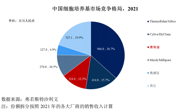 依据弗若斯特沙利文,2021年中国培养基市场规模达到26.3亿人民币,2017-2021年的复合年增长率为44.0%。预计2026年中国细胞培养基市场规模将达到71.0亿人民币,2021-2026年的复合年增长率为22.0%。 中国细胞培养基市场中, 仍以进口品牌为主,三大进口厂商即赛默飞、丹纳赫和默克占比超过60%,澳斯康和奥浦为国产品牌第一、第二位。 随着国产培养基质量的提升以及灵活的市场策略,国产培养基的市场份额从2017年的19.2%预计增长至2021年的33.7%。 2021年在新冠疫苗需求大增以及生物制药快速发展的情况下,澳斯康超过默克,市场占有率由2020年的7.1%进一步增长至12.3%,市场份额排名第三位。