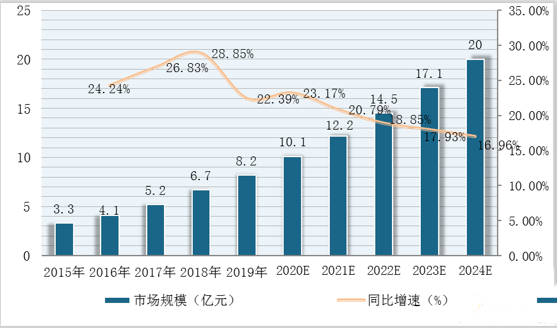 随着我国体外诊断行业的快速发展,产业链上游的体外诊断原料市场需求也快速扩大,市场规模从2016年的41亿增长至2019年的82亿元,2016-2019年的年均复合增长率为26%;预计2024年的市场规模将达到200亿元,2019-2024年的年均复合增长率将达到19.4%。