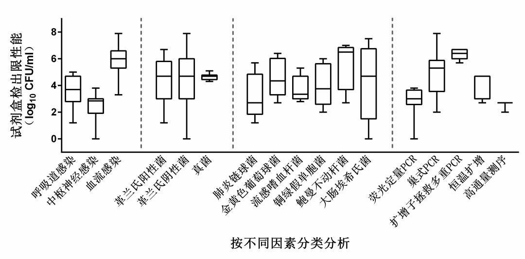 按呼吸道、中枢神经及血流3种感染类型分析试剂盒的病原菌谱检出限性能,中位值(最小值,最大值)分别为5×103 CFU/ml(15 CFU/ml,5×104 CFU/ml)、1×103 CFU/ml(1 CFU/ml,6×103 CFU/ml)及1×106 CFU/ml(2×103 CFU/ml,8.5×107 CFU/ml)
