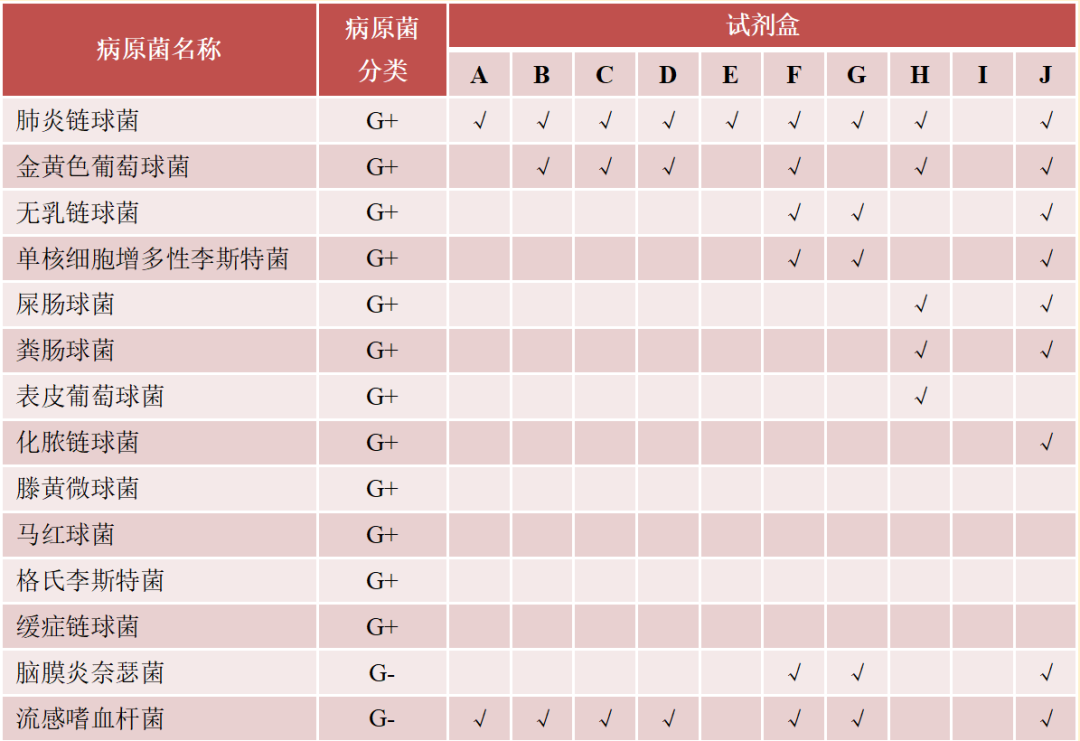 对于文中分析的10款试剂盒,其检测范围或病原菌谱既有重叠又各不相同。例如,呼吸道试剂盒、中枢神经试剂盒及血流试剂盒的病原谱均包含肺炎链球菌、金黄色葡萄球菌、流感嗜血杆菌、铜绿假单胞菌、鲍曼不动杆菌及大肠埃希氏菌等6种细菌;百日咳杆菌、嗜肺军团菌、嗜麦芽窄食单胞菌、卡他莫拉菌、肺炎支原体、肺炎衣原体及烟曲霉等7种细菌和真菌仅出现在呼吸道感染试剂盒病原谱中;新生和格特隐球菌仅出现在中枢神经感染试剂盒病原谱中;化脓链球菌、近平滑念珠菌及克柔念珠菌等3种细菌和真菌仅出现在血流感染试剂盒病原谱中。各试剂盒具体病原菌谱见表2。