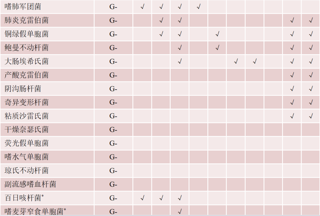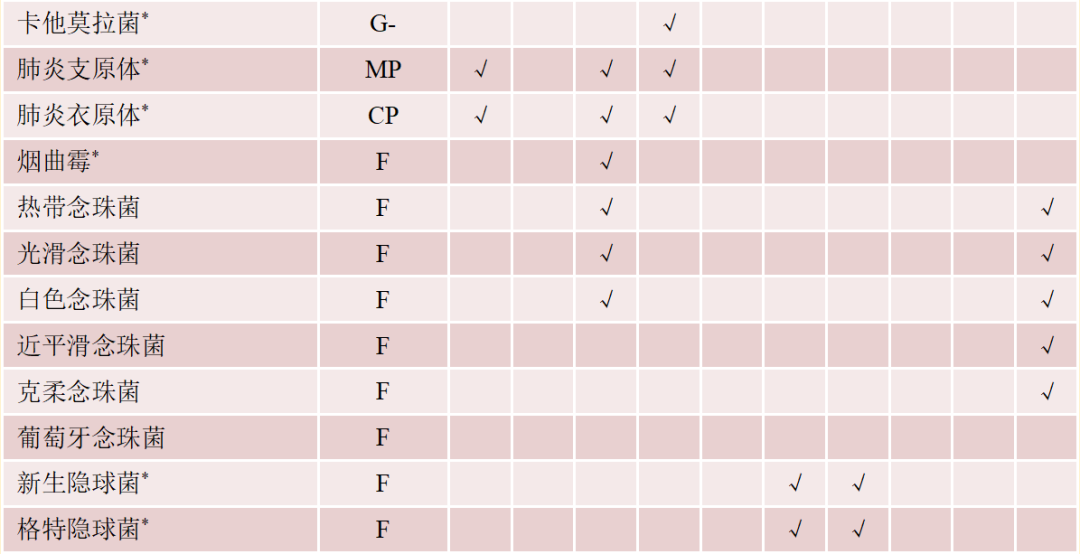 注:*. 国家参考品中未覆盖的病原菌;G+. 革兰阳性细菌;G-. 革兰阴性细菌;F. 真菌;MP. 肺炎支原体;CP. 肺炎衣原体;√. 该菌在病原菌谱中