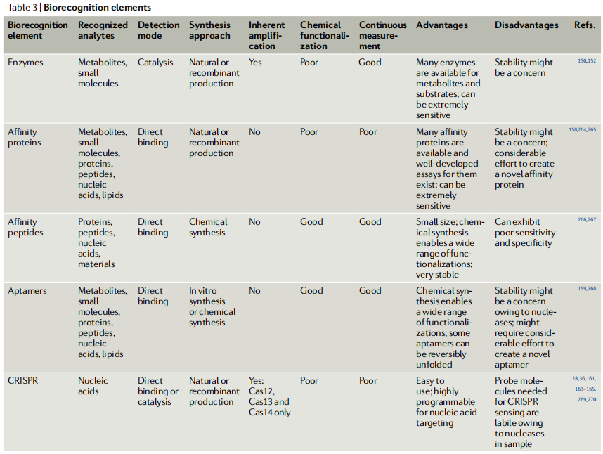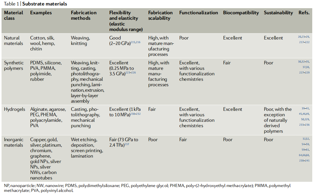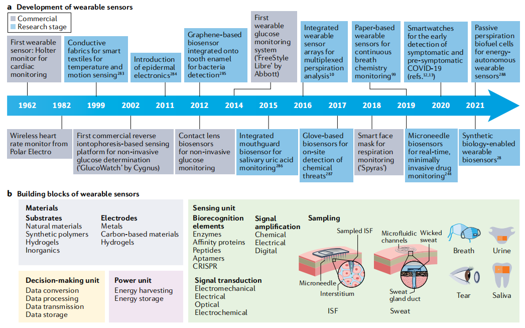 近日,来自于德国、英国、美国MIT的一组研究团队在顶刊Nature reviews materials上发表了一篇题为“End-to-end design of wearable sensors”的综述文章,本文详细介绍了可穿戴传感器领域的最新发展,重点介绍了传感器的材料、传感、决策和动力单元,为可穿戴设备的设计和实现建立框架。同时还分析了当前的趋势,讨论了挑战,并提出了建议,以确定该领域在未来十年如何发展,从而推进医疗保健改革。 图片来源:Nature reviews materials 01 可穿戴传感器概述 可穿戴传感器是一种集成的分析设备,允许以无创或微创的方式连续监测个人的生物特征,从而能够检测随时间推移基线值的微小生理变化。尽管组件的总数量可能因具体应用而有所不同,但可穿戴设备的常见构建块是基底和电极材料、传感单元(用于接口、采样、生物识别、信号转导和放大的元件),决策单元(用于数据收集、处理和传输的组件)和动力单元。 第一代可穿戴设备,以手表、鞋子或耳机的形式,主要侧重于通过跟踪身体活动、心率或体温等进行生物物理监测。随着第一代可穿戴设备的广泛采用和成功,重点逐渐转向无创或微创生化和多模式监测,这是实现真正个性化医疗的下一步。这些第二代可穿戴设备包括皮肤贴片、纹身、牙齿贴片、隐形眼镜等形式,以及更具侵入性的微针和可注射设备。第二代可穿戴设备的一个关键特征是使用生物流体,利用生物识别元件将特定分析物的存在转化为可检测信号。这些例子大多仍在实验室中测试,但也有一些已经商业化(包括 FreeStyle Libre glucose monitoring system和 Gx Sweat Patch))。可穿戴生化和生物物理传感器已用于检测和管理疾病以及健康应用。然而,可穿戴设备的使用超出了以人为中心的健康监测,因为它们在宠物和畜牧业市场的动物健康监测中也得到了广泛应用。 由于主要使用物理传感器的第一代可穿戴设备已经成熟,并且有许多商业实例,研究团队通过综述采样生物流体以及用于分析物传感的生物认知元件,更加重视第二代可穿戴式设备的持续发展。 可穿戴传感器开发中主要里程碑的时间表及其构建模块。图片来源:Nature reviews materials 02 基底材料 设备中的基材不仅必须具有设备部件功能所需的性能,还必须具有灵活性、弹性和韧性。研究团队主要讨论了可穿戴设备开发中使用最广泛的四类:天然材料、合成聚合物、水凝胶和无机材料。 天然材料 在可穿戴设备中使用天然材料,包括棉花、羊毛、丝绸、大麻、亚麻和甲壳素的一个好处是,相关制造方法,如编织和针织已经成熟。此外,这些材料具有耐磨基材所需的必要机械强度、灵活性和用户舒适性,并且具有生物相容性和可持续性,这是可穿戴材料的关键优势。然而,天然材料本身缺乏某些理想的物理特性,包括导电性和光学特性,由于这一限制,天然材料通常被用作可穿戴设备的辅助材料,如掺杂碳纳米管棉线,用银纳米线包覆羊毛纤维,或用石墨烯修饰丝绸等。 合成聚合物 合成聚合物是制造可穿戴传感器最广泛使用的功能材料。聚合物有多种制造方法可供选择,包括传统上天然材料来源的编织等方法,也可以使用如模塑、挤压、层压、沉积、光刻、铣削或3D打印等新技术,这种多功能性很容易实现各种形状因素。其次,聚合物系统的性质可以通过一系列广泛的物理和化学功能化来改变。但大多数由合成聚合物制成的可穿戴设备设计为一次性使用或使用寿命有限,再加上回收高级聚合物的困难,使得聚合物的可持续性较差。 水凝胶 由于水凝胶具有高度的生物相容性,水凝胶的开发主要发生在生物医学工程领域,其重点是用作可植入材料或离体细胞支架。水凝胶是一种柔软、可变形和透明的材料,其亲水性和多孔网络允许高含水量,这使得水凝胶具有高度的生物相容性,使其适用于涉及皮肤、伤口或身体界面的应用。水凝胶已被用于机械和化学传感的可穿戴设备、药物输送的仓库以及基于细胞的活体传感器的维护。 无机材料 最后一类材料是无机材料,包括金属、半导体和纳米材料。这些材料具有如高导电性等特性。此外,许多纳米材料在所需的柔性和弹性方面具有优异的机械特性。无机材料在可穿戴设备中的应用通常限于关键功能部件,用来限制成本。但无机材料的生物相容性是一个值得关注的领域,纳米材料尤其具有潜在的生物危害风险。因此,这些材料通常仅限于与用户不密切接触的可穿戴设备部分。 由于可用材料种类繁多,在确定可穿戴设备的设计时,必须考虑几个因素,包括感兴趣的具体应用、期望的性能水平、目标形状系数、原型制作和放大制造过程中的易制造性、成本和可持续性。 不同基底材料的对比。图片来源:Nature reviews materials 03 传感单元 第二代可穿戴设备传感单元的核心是对含有分析物的生物流体进行采样。然后,目标和生物认知元件之间的分子相互作用被转换为传感器输出,并通过信号转导和放大单元进行放大。 生物流体和取样。 在本节中,研究团队总结了第二代可穿戴设备所针对的不同类型的生物流体,重点关注可穿戴传感器生物采样的考虑因素和挑战。 间质液(ISF)填充细胞和组织结构之间的细胞外空间。ISF包含与血液相似的蛋白质组学和代谢组学特征,因此是生物标志物的丰富来源。可穿戴ISF采样有两种主要方法:微针和离子电渗提取。 微针通常由生物相容性合成聚合物
