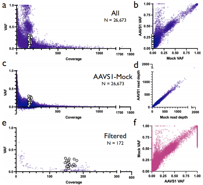 AAVS1样本中存在的体细胞变体,而Mock对照中未发现的,共26673个变体(图a,b)。但几乎所有高VAF变体都是在低读取深度下发现的,这表明这些变体可能不是AAVS1所特有的真实变体,而是在模拟样本中未进行足够深度测序的胚系变体。过滤掉胚系变体以及测序噪声,总共留下173个变量(图e)。其中,19个变体位于AAVS1 gRNA的预测目标位点,在其余候选脱靶变体中,发现与AAVS1-gRNA没有同源性,可能由于低覆盖率导至假阳性。