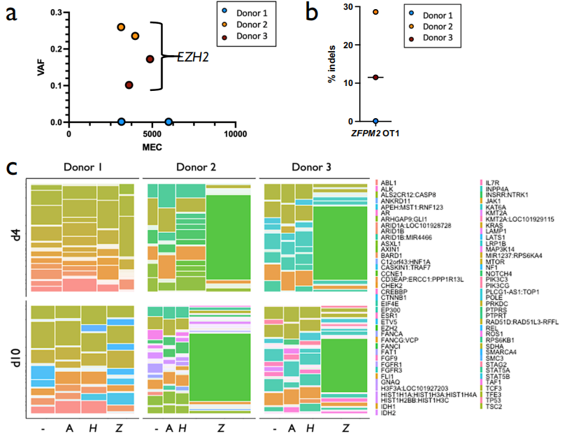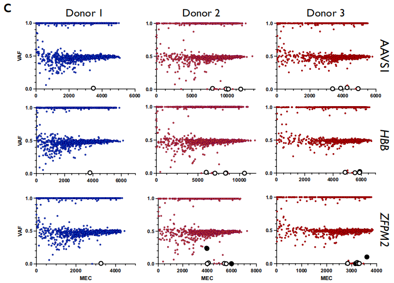为了确定用Cas9编辑是否在肿瘤抑制基因或癌基因中引入突变,研究团队随后绘制了所有三个供体在第4天和第10天所有Cas9治疗组的VAF x MEC。接下来通过消除所有同义突变和/或胚系变体数据库中先前报告的突变剔除非致病性变体。与Mock样本相比,Cas9处理组具有更少的剩余变体(每个条件下的1487.9个可重复变体的平均剩余3.3个变体)。因为在Mock样品中发现的任何变体都不是被Cas9引入的,将其移除用于下游分析。在18个Cas9处理组中,过滤后仅剩下6个变体,其中4个是第4天和第10天ZFPM2处理中供体2和3中预期的EZH2突变。另外两个变体均为供体2和供体3中d10 ZFPM2处理中发现的SNV,其VAF<0.0015,接近检测极限。