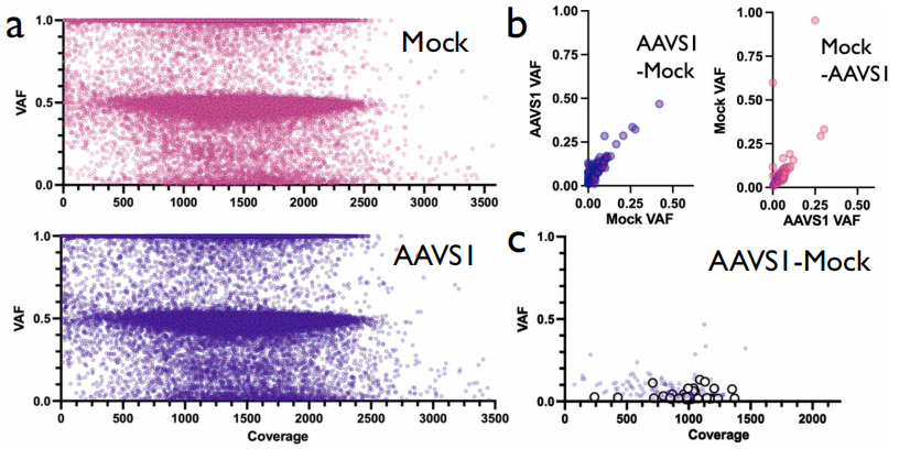 接下来将脱靶活性的搜索扩展到整个外显子组。外显子组分析在AAVS1处理中鉴定了137种体细胞变体,在Mock条件下鉴定了92种变体(图b)。