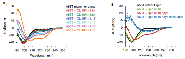 研究团队研究了α-Syn和含有心磷脂(CL)的100 nm大小脂质小泡之间的相互作用。结果表明,α-Syn在含有CL的囊泡存在的情况下首先采用α-螺旋构象。随着CL含量和脂:蛋白摩尔比的增加,检测到α-螺旋结构增加。随着时间的推移,α-螺旋结构逐渐转变成一系列的蛋白质结构混合物,其中β-sheet含量显著。这些数据证实,α-Syn最初与CL相互作用并形成二级结构(α-螺旋),但随着时间的推移,逐渐转变为β-sheet。另有数据显示,A53Tα-Syn与脂质小泡的相互作用不仅导至CL的提取,还导至CL并入淀粉样纤维,并且这些聚集物与CL的共定位增加。