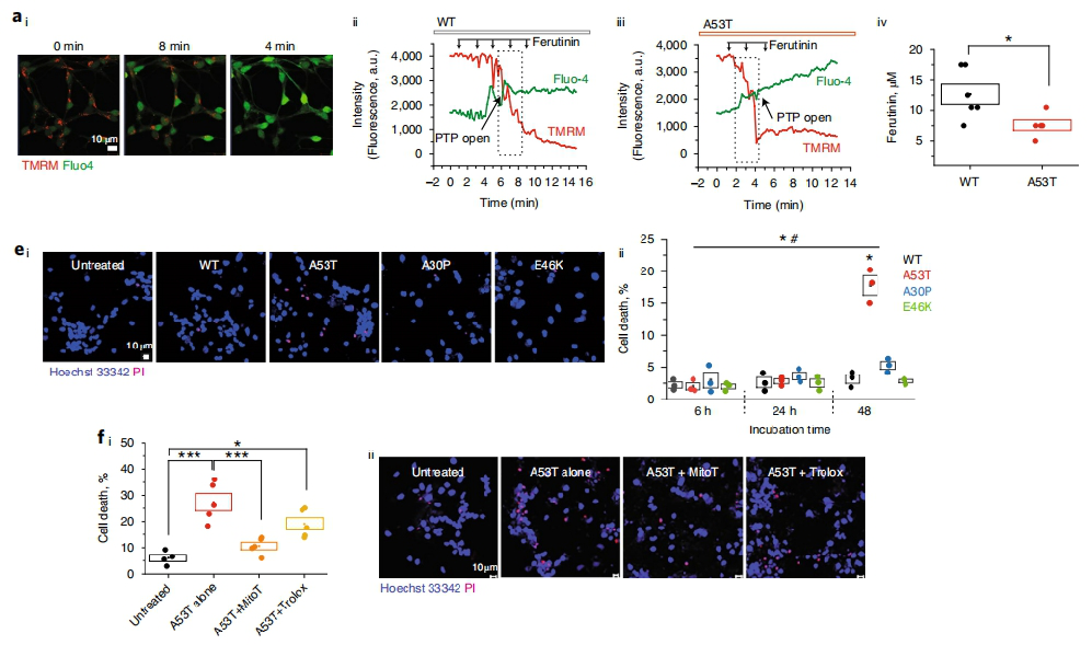 A53Tα-Syn诱导mPTP开放,mROS加速聚集和细胞死亡。图片来源:Nature Neuroscience