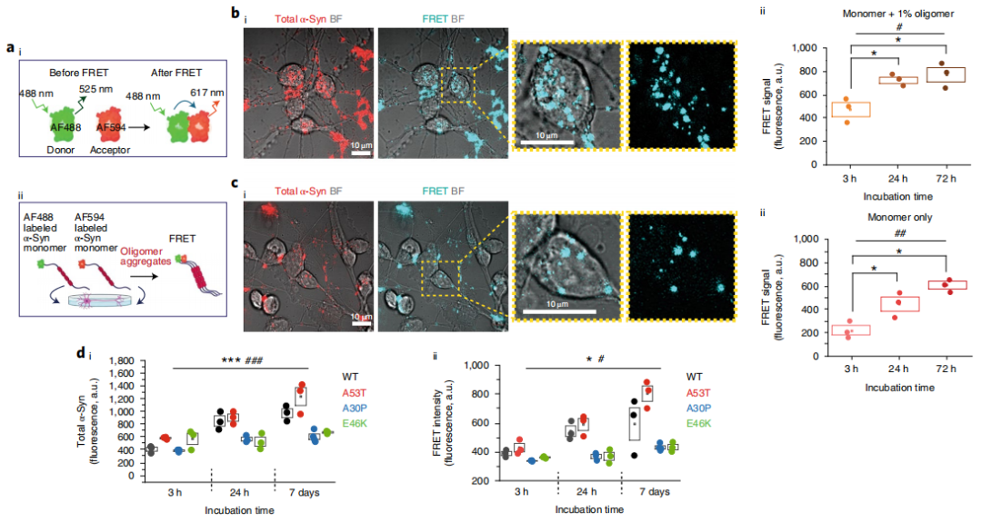 只使用α-Syn单体(没有低聚物)的情况下,在初始滞后阶段后,FRET信号强度增加(图c)。3 小时以内,500 nM单体诱导FRET信号(低聚物形成),而50 nM 在48小时诱发FRET信号。WT和所有突变体的总α-Syn摄取量和FRET信号增加呈现时间依赖性(图d)。A53T在直接激发信号和细胞内FRET信号方面表现出最大的增加,这表明与其他突变相比,摄取和低聚化增加。