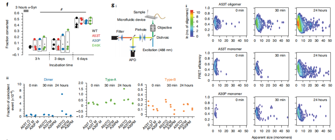 WTα-Syn的FRET效率随着时间的推移而增加,表明该蛋白可以在细胞内寡聚和结构转化。在早期时间点(3 小时和3 天),仅FRET效率低的低聚物群体存在。3天之后 ,第二批FRET效率较高的低聚物开始出现。从单体到低聚物的组装发生得很快(<3 小时),而转化为高FRET低聚物的时间长达数天。A53T、A30P和E46K突变体也显示了细胞中类似的结构转换。