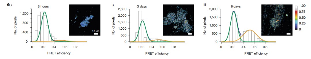 smFRET可以确定体外结构从毒性较小、松散相关的“A型”低聚物转变为毒性大、抗蛋白酶K、富含βsheet的“B型”低聚物。利用此处检测到的细胞内FRET信号,研究团队通过计算细胞内聚集物的FRET效率(E)来确定低聚物的不同FRET群体是否可以在神经元内形成。