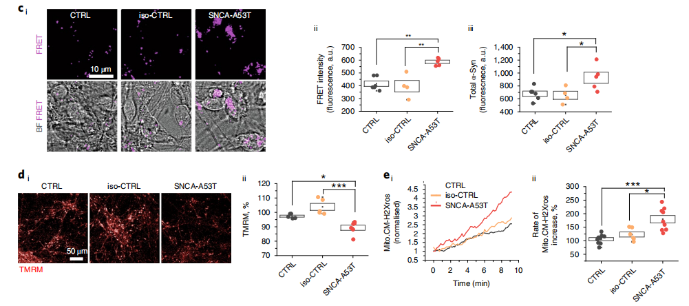 从两名携带A53T突变(SNCA-A53T)的患者、一名iso-CTRL患者和两名健康志愿者(CTRL)的hiPSCs中生成皮层神经元。与对照神经元相比,SNCA-A53T iPSC衍生的神经元积累并分泌更多具有渗透能力的内源性寡聚物。与对照细胞相比,SNCA-A53T神经元显示出较高的细胞内FRET信号和总α-Syn摄取量(图c)。并且SNCA-A53T神经元表现出异常的线粒体功能,类似于直接应用A53Tα-Syn后观察到的线粒体功能:膜电势差降低(图d),mROS产生增多(图e),复合I抑制,PTP早期开放。