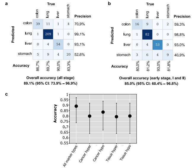 在癌症转移之前发现癌症是成功抗癌的关键。最近,无细胞DNA(cfDNA)因其在早期癌症检测中的实用性而受到关注。具体而言,cfDNA甲基化已被证明是一种非常有前景的特征,不仅能够检测癌症,而且能够定位其起源组织(TOO)。尽管它前景广阔,基于cfDNA的癌症检测面临着一些主要挑战:(1)早期癌症患者血液中肿瘤cfDNA的比例可能很低,(2)不同癌症类型、亚型、阶段和病因的cfDNA异常特征是异质的;(3)与疾病的多样性和患者群体(年龄、性别、种族和共病)相比,目前可用的样本量较小,尤其是对于泛癌检测而言。 为了应对cfDNA中肿瘤比例(tumor fraction)极低的挑战,甲基化组检测可以利用血液中尽可能多的cfDNA片段,而不似传统深度测序方法只捕获所有肿瘤cfDNA片段的一小部分。为了解决癌症的分子异质性,基于甲基化组的检测可以覆盖不同癌症类型和病因的甲基化标记的广阔前景。为了应对目前可用样本量有限的挑战,基于甲基化组的测试可以随着训练队列的增长学习和利用新的重要标志物。尽管cfDNA甲基化组分析具有优势,但常用的全基因组甲基化测序(WGBS)成本太高,无法用于临床应用。 近日,来自顶尖学府UCLA的研究团队在Nature Communications上发表了一篇题为“Cost-effective methylome sequencing of cellfree DNA for accurately detecting and locating cancer”的文章,在这篇文章,研究团队提出了一个完整的实验和计算系统,用于准确和相对便宜的癌症检测。它包括(1)一种用于cfDNA全基因组甲基化分析的成本效益高的实验分析,称为无细胞DNA甲基化组测序(cfMethyl-Seq),以及(2)一种提取四种类型的cfDNA甲基化特征(癌症特异性和组织特异性高甲基化和低甲基化标记)的计算方法,并执行集成学习以检测和定位癌症。结果显示:(1)检测癌症:总体AUC为0.974,总体敏感性为80.7%,特异性为97.9%。单个癌症类型的敏感性范围为75.9%至92.3%。(2)定位癌症:肿瘤TOO预测的准确率为89.1%。研究团队同时还进行了广泛的验证,例如跨批次验证、跨来源验证、年龄匹配验证、以及独立验证,以确认此方法的稳健性。 图片来源:Nature communications 主要内容 低成本的无细胞DNA甲基化组测序(cfMethyl-Seq) 研究团队开发了cfMethyl-Seq技术,以解决低成本分析cfDNA全基因组甲基化的挑战。传统的RRBS方法,也可以从完整的基因组DNA丰富CpG富集区。 cfMethyl-Seq过程如下图所示,基于cfDNA构建的cfMethyl-Seq文库显示特征条带,长度为68bp,135 bp和203 bp(图b)。将cfMethyl Seq文库与cfDNA WGBS文库以及实体组织RRBS文库进行了比较。34.11%、12.38%和13.14%的cfMethyl-Seq读数来自CpG island、shore和shelf地区,而传统RRBS读数分别为33.65%、13.35%和14.04%(图d)。对于WGBS cfDNA库,只有2.66%的读取来自CpG岛,但大多数(88.32%)来自无信息的“open sea”区域。也就是说,cfMethyl Seq在CpG岛上比WGBS富集12.8倍。 cfMethyl-Seq 检测技术。图片来源:Nature communications 用于癌症检测和组织起源预测的甲基化标志物的发现 研究团队生成了用于标志物发现的328个实体组织的RRBS数据,包括131对实体肿瘤及其邻近的正常组织,包括结肠癌(19对)、肝癌(53对)、肺癌(44对)和胃癌(15对)。确定了实体肿瘤及其邻近正常组织之间存在显著差异的癌症特异性标记物。此外要求癌症特异性标记物在实体肿瘤和30个参考非癌症个体的cfDNA之间具有差异甲基化。在10次运行中,平均获得了23748个癌症特异性高甲基化标记和28197个癌症特异性低甲基化标记用于癌症检测。 为了预测TOO,还确定了任何两种实体肿瘤类型之间以及实体肿瘤和30例参考非癌血浆样本之间显著不同的标记物。在10次运行中,为了预测癌症TOO,研究团队平均获得30474个肿瘤特异性高甲基化和33890个肿瘤特异性低甲基化标记。 组织特异性cfDNA有助于检测癌症和预测其TOO。研究团队确定了任何两种实体正常组织之间存在显著差异的标记,包括7547个组织特异性高甲基化和7212个组织特异性低甲基化标记物,可以区分成对的组织类型。 癌症检测的性能 408份cfDNA样本的cfMethyl-Seq数据采集自191名非癌症患者和217名癌症患者(分别来自结肠癌、肝癌、肺癌和胃癌患者的49、30、106、32名)。从217个癌症cfDNA样本中,随机选择75%作为训练数据,25%作为测试数据;从191个非癌cfDNA样本中随机选择了25%作为测试数据,在剩余的75%中,随机保留了30个仅用于标志物发现的非癌cfDNA样本,并将剩余的非癌cfDNA样本用作训练数据。 标志物类型的排名从高到低依次为癌症特异性高甲基化标志物(0.966)、组织高甲基化标志物(0.957)、癌症特异性低甲基化标志物(0.944)、组织低甲基化标志物(0.939)。通过整合四种标记物类型,癌症检测总体模型的AUROC为0.974,在97.9%的特异性下,敏感性为80.7%(图a)。对于早期癌症(I期和II期)样本,整体模型的AUROC为0.964,敏感性为74.5%,特异性为97.9%。当将这些结果分解为各个癌症类型和阶段时(图b),在所有情况下的敏感性均达到或超过63%。 用于癌症检测的集成模型的性能。图片来源:Nature communications TOO预测的性能 使用相同的验证策略来评估癌症样本的TOO预测性能。癌症特异性高甲基化标记的平均准确率为80.0%,癌症特异性低甲基化标记为83.6%,组织特异性高甲化标记为79.4%,组织特异性低甲基化标记物为80.0%。通过整合四种标记类型,TOO预测集成模型在所有阶段的平均准确率达到89.1%。对于早期癌症患者,模型平均准确率为85.0%。,所有阶段的结肠癌/肝癌/肺癌/胃癌TOO预测准确率为86.7%/89.