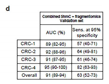 在癌症仍处于早期阶段时对其进行检测和治疗,可以挽救许多生命,降低发病率,并减轻癌症对医疗系统的负担。 液体活检是一种微创方法,用于检测体液如血液和尿液中的早期癌症。开发一种足够强大的液体活检检测方法来检测癌症有很多挑战,尤其是在早期疾病中,肿瘤仅向血液中释放微量生物标记物时。在早期疾病中,循环肿瘤DNA(ctDNA)仅占总无细胞DNA(cfDNA)的0.1–1%。从同一血液样本中测量多种生物标记物的多分析方法可能有助于检测早期癌症。 表观基因组学的变化可能先于肿瘤发生的遗传变化。因此,利用cfDNA的表观基因组进行癌症检测的兴趣越来越大。几个小组已经研究了是否可以通过cfDNA肿瘤部分的表观遗传修饰来检测癌症,因为DNA甲基化、DNA羟甲基化和cfDNA特征可能揭示染色质结构。胞嘧啶的甲基化产生甲基胞嘧啶(5mC)是一种众所周知的控制基因表达的表观遗传机制。5mC被氧化形成5-羟甲基胞嘧啶(5hmC)。5mC和5hmC具有不同的功能作用:5mC存在于异染色质和常染色质中,通常抑制基因表达,而5hmC主要存在于常染色质,与大多数高转录的基因及其增强子相关。 癌症样本中不同的功能作用和分布表明,5mC和5hmC作为生物标记物具有独立的效用。然而,寻找癌症的表观遗传标记物受到了技术限制,区分5mC和5hmC的技术有限。然而,最近出现了几种技术来量化和利用5hmC特征用于通过液体生物检测进行癌症检测。5hmC在晚期转移癌中逐渐丢失的观察结果表明,其作为生物标记物的能力可能是阶段特异性的。 近日,来自剑桥大学的研究团队在杂志Scientific reports上发表了一篇题为“Hydroxymethylation profile of cell-free DNA is a biomarker for early colorectal cancer”的文章,在这项研究中,研究团队测量了整个cfDNA中的5hmC水平,并训练了一个分类器来区分结直肠癌患者和对照组。研究团队在一个独立的验证集中评估了分类器的性能,并评估了其对癌症分期和ctDNA水平的依赖性。研究表明,cfDNA的5hmC图谱是癌症的强预测因子,包括早期癌症检测的高灵敏度。数据表明,cfDNA表观遗传变化产生的5hmC信号在早期阶段比其他分析物更敏感。当5hmC信号与cfDNA片段特征相结合以产生附加信号时,这种灵敏度保持不变。 图片来源:Scientific reports 主要内容 从cfDNA中高效捕获5hmC以产生羟甲基化组学文库 研究团队仅用5 ng cfDNA捕获了含有5hmC残基的cfDNA片段的羟甲基化组学。从2ml血浆中提取cfDNA,使用5ng cfDNA制备Illumina兼容测序文库。测序文库被变性,单链文库被复制以创建一个双链文库,其中只有一链保留表观遗传信息。5hmC残基用修饰的葡萄糖基团进行标记,然后生物素化。使用链霉亲和素珠捕获含有双链DNA片段的5hmC。从5hmC捕获的文库中回收未经表观遗传修饰的复制链,并扩增形成羟甲基化组学富集测序文库。 所有样本中均包含对照DNA序列,以报告羟甲基化组学捕获的有效性和定量。阳性对照组含有1、3或6个5hmC残基,在羟甲基化组学中富集,与输入文库相比,分别多读88、267和658倍。含有6 mC残基或未修饰胞嘧啶的阴性对照未被浓缩(分别为1倍和0.38倍)(图B)。 羟甲基化组学中富集结果。图片来源:Scientific reports 5hmC分类器高效检测包括早期阶段在内的CRC 使用增强子区域中的5hmC水平训练监督分类器算法,以区分CRC和对照组(405个CRC样本和296个对照组)。将5hmC分类器应用于验证集(220个CRC和164个对照),区分CRC和对照组的AUC为90%。AUC 4期最高(94%),在1期略微下降至89%(图A)。 5hmC分类器的特异性为84%,CRC敏感性为80%(1、2、3和4期分别为78%、83%、75%和93%)。在验证样本中,当特异性固定在95%时,以55%的灵敏度检测CRC(所有阶段合并)。 研究团队训练了5hmC分类器,成功地将肺癌(AUC 80%)、乳腺癌(AUC 82%)和前列腺癌(AUC 79%)与对照组区分开来。还训练了一个5hmC分类器,将CRC与其他癌症区分开来(AUC 78%)。且结果表明5hmC分类器对低循环肿瘤DNA(占游离细胞DNA的比例)具有鲁棒性。 5hmC分类器高效检测各期CRC。图片来源:Scientific reports 5hmC分类器在低ctDNA比例下具有鲁棒性 为了进一步研究5hmC分类器在不同癌症阶段的性能相似的发现,使用ichorCNA肿瘤比例统计估计了验证集中cfDNA样本中ctDNA的数量。据报道,ichorCNA的检测限在平均测序深度为0.1x时为3%。 使用3%阈值作为检测限,5hmC分类器正确地区分了97%的可检测肿瘤比例的CRC样本和75%的肿瘤比例低于3%检测阈值的CRC样品(图C)。这表明,当在低ctDNA比例下,5hmC分类器是鲁棒的。因此,研究团队推断5hmC分类器不仅仅依赖于ctDNA部分。 5hmC分类器在低ctDNA比例下具有鲁棒性。图片来源:Scientific reports 白细胞介素信号可能推动基于5hmC的分类 为了研究驱动5hmC分类器在低ctDNA比例CRC样本中性能的生物信号,将分类器的特征增强子映射到基因名称,并在Key Pathway Advisor软件(Clarivate)中查询。IL11信号转导到PIK3CA级联是最重要的途径。这表明来自免疫系统的cfDNA片段可能驱动检测。研究团队进一步评估了仅使用早期CRC样本(1期和2期)训练分类器时识别出的特征,并将其与仅使用晚期CRC样本训练的分类器的特征进行了比较(3期和4期)。结果发现白细胞介素信号存在于晚期CRC中。 白细胞介素信号可能推动基于5hmC的分类。图片来源:Scientific reports 与5hmC分类器相比,片段组学分类器的性能对癌症分期和ctDNA比例的依赖性更大 为了调查观察到的5hmC分类器明显缺乏分期依赖性,研究团队研究了来自相同样本(验证集)