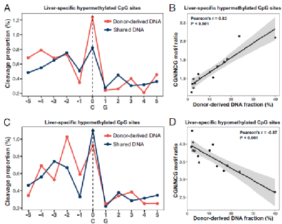 为此,研究团队首先以肝移植为模型,探索追踪CpG周围组织特异性裂解模式的可行性。通过分析此前报道的肝移植受者血浆DNA样本的亚硫酸氢盐测序结果,研究团队确定了肝脏特异性的高甲基化和低甲基化CpG位点。供体来源的DNA分子在肝脏特异性高甲基化CpG位点0位置的裂解比例与共享的相比增加了51.0%;与之相反,在位置1对应的比例下降了31.3%。因此,研究团队认为,基于与甲基化差异相关的特定裂解偏好,CGN和NCG基序的表达与CpG位点甲基化的变化相关。