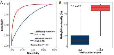 为了获得足够的测序深度来分析裂解比例,研究团队收集了来自8名健康对照组和13名HBV携带者的亚硫酸氢盐测序数据。随后,将基于训练数据集的模型参数用于分析测试数据集,以输出一个概率得分(在该研究中称为甲基化得分),用来表明CpG位点被高甲基化的可能性。数据显示,用来区分CpG位点是高甲基化还是低甲基化的该深度学习模型AUC高达0.93。与甲基化评分≥0.5的CpG位点相比,甲基化评分< 0.5的CpG位点的甲基化指数显著降低。值得注意的是,如果只使用CpG位点周围的序列,不使用cfDNA裂解模式,该模型性能显著下降,AUC为0.72,进一步突出裂解模式对甲基化分析的准确性有显著贡献。以上结果证明了利用cfDNA片段模式推断单个甲基化CpG状态的可行性。