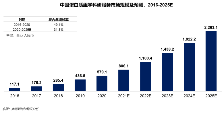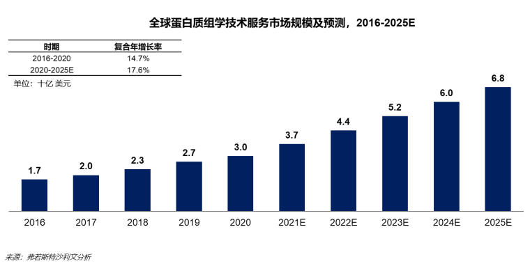 蛋白质组学市场 ![]() 市场规模 根据弗若斯特沙利文的数据显示,全球蛋白质组学技术服务市场规模于2016年的17亿美元增长到2020的30亿美元,年复合增长率达14.7%,预计2025年将达到68亿美元。 我国蛋白质组学发展较晚,仍处于行业早期阶段,但市场规模增长速度远高于全球水平。市场规模从2016年的1.2亿元增长到2020年的5.8亿元,年复合增长率高达49.1%,预计2025年达到22.6亿元。 ![]() 相关政策