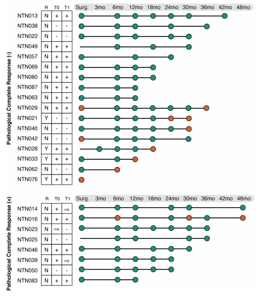 新辅助治疗广泛应用于三阴性乳腺癌(TNBC)患者。这种治疗方法允许在体内评估临床有意义的反应,从而能够快速识别用于定制辅助全身治疗的有效药物。接受新辅助全身治疗的TNBC患者中,约30%至65%的患者实现了病理完全缓解(pCR)。未达到pCR的患者往往复发率高,总体生存率低。非pCR患者的3年远处复发风险为27%,而达到pCR的患者为9%。新辅助化疗后的3年无事件生存率在无pCR患者中约为57%-68%,而在pCR患者中为92%-94%,一旦TNBC复发,中位生存期仅有18–28个月。化疗无法根除微小残留疾病被认为是由于对化疗具有内在抗性的细胞逃逸,而常规临床实践中使用现有工具无法检测到这些细胞。 在这种情况下,液体活检测量循环肿瘤DNA(ctDNA)为评估化疗的实时反应提供了一种有希望的工具。在晚期TNBC中,下一代ctDNA测序显示出与组织活检中发现的突变高度一致。ctDNA也被评估为预测乳腺癌患者预后的一种有前景的工具。 大多数早期TNBC患者ctDNA的传统测序方法都使用了针对TNBC中常见的复发突变基因的通用模板。在这些研究中,模板不包括每个个体肿瘤特有的体细胞变体。由于TNBC具有高度的患者间异质性,这样的通用分析可能会忽略患者特有的分子变化。 近日,一组来自美国的研究团队在杂志Scientific reports上发表了一篇题为“Personalized ctDNA micro-panels can monitor and predict clinical outcomes for patients with triple-negative breast cancer”的文章,在文章中,研究团队报告了一项对50名患者的研究结果,试图确定化疗前、化疗中和化疗后的纵向追踪ctDNA水平是否可以预测正在进行的前瞻性试验中治疗的TNBC患者的临床结果。 图片来源:Scientific reports 主要内容 临床数据 纵向调查ctDNA的队列共包含50名患者,平均年龄为52岁(25-74岁),32%为非裔美国人,84%临床分期为II期。7名患者(14%)出现疾病复发,5名患者(10%)在报告生成时死亡。 样本采集和测序方法概述。图片来源:Scientific reports 用于定制ctDNA微面板开发的 全外显子组测序 在基线正常和配对肿瘤样品进行全外显子组测序。在所有靶向外显子位置,正常和肿瘤样本的中位数覆盖率为79个碱基和73个碱基。所有肿瘤的体细胞变异中位数为77.5(下图)。总共鉴定出7513个变体。在86%的肿瘤中发现了TP53突变(n = 43例患者)。两个样品(NTN069和NTN056)具有较高的突变负荷(> 750个变体);两个患者都没有观察到BRCA1/BRCA2变体。在所有50名患者中选择了208个WES变体,用于开发定制ctDNA微面板。 在基线(T0)时,有8个样本具有肿瘤组织的WES和定制的外周血ctDNA微面板测序。在8个样本中的33个可检测变异中,82%(n=27个变异)在组织和外周血中都可检测到,这证明了肿瘤测序与外周血测序的准确性和一致性。基线肿瘤组织中变异的平均VAF为32.9%,而外周血中变异的VAF为0.33%。 肿瘤/匹配正常基因组DNA基线(T0)WES瀑布图。图片来源:Scientific reports ctDNA监测与临床结果 总共,针对所有50个患者样本的208个独特变体。在本研究分析的50名患者中,有7名患者在疾病监测期间报告了临床复发。其中4例在报告复发的6个月内进行了ctDNA测序(下图)。四名患者中有三名在报告临床复发之前表现出患者特异性扩增子特征的分子复发,另外一名患者在手术时表现出持续性/残留性疾病,然后在手术后2个月复发。另外有3名患者出现临床复发,但他们最近的ctDNA时间点在复发前6个月以上,排除了ctDNA微面板预测临床复发的能力。这些数据表明,如果在临床复发的6个月内进行ctDNA微组,则使用ctDNA微板在临床复发之前检测到4名患者中的4名患者的分子复发。 21名患者在监测期间未出现临床复发。其中17例使用定制ctDNA微面板显示分子缓解。有4名患者表现出潜在的分子复发,但没有临床复发。一名患者(NTN0022)在预计的临床复发时间内失去随访。其他3例患者在潜在的分子复发后至少随访22个月。鉴于每个样本的3-4个变体中只有一个在分子水平上被检测为阳性,这些样本可能是假阳性。 临床复发前表现出分子复发的患者。图片来源:Scientific reports ctDNA阳性与pCR的关系 在本研究中分析的50名患者中,25名患者可用于评估ctDNA作为复发的生物标志物。如果定制ctDNA微面板中的任何变体具有VAF > 0.005%,则确定样品具有阳性ctDNA结果. 在每个时间点对每个患者进行评估,以确定阳性率。在8名pCR患者中,只有1名患者(12.5%)在缓解期间时间点显示ctDNA阳性。相反,在17名无pCR的患者中,8名患者(47%)在缓解期至少一个时间点显示ctDNA阳性。pCR患者与非pCR患者的阳性率差异无显著性,但呈趋势性相关(p值 = 0.10; 卡方检验)(下图)。 分子复发(肿瘤特异性VAF检测)与病理完全反应(pCR)之间的关系。图片来源:Scientific reports 总结与讨论 这项观察性研究表明,应用于ctDNA的4-6个患者特异性变体的定制微面板可用于预测和监测早期TNBC患者的疾病复发。这个定制面板中的每一个变体都是个体独有的,从而可以在临床复发之前精确地识别分子复发。ctDNA中患者特异性变异的检测也显示出与pCR失败的趋势相关性,提示TNBC患者的潜在预后效用。 定制ctDNA微面板的使用提供了相对于传统通用面板的可能改进,传统通用面板具有针对所有正在评估的肿瘤的设定数量的基因/位点。通用面板的使用可能不包括在监测期间提供足够灵敏度检测分子复发的有用变体,这些变体可能提供临床相关信息,如分子复发和与pCR的关联。 为每个个体的肿瘤识别的自定义变体不需