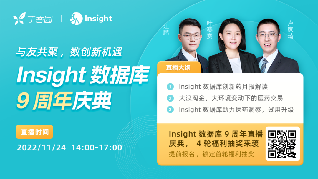 Insight数据库面向医药行业的同仁提供药品全生命周期数据查询,从申报进度、品种筛选到一致性评价、企业分析,今年重磅打造了「全球新药」功能,包括全球新药、临床试验结果、医药交易等模块。 通过「医药交易」可见,全球药品/技术交易事件从2016年开始快速增长,至2020年达到高峰(全球1273起交易,累积交易额2676亿美元),2021-2022仍保持高位。 近几年来,随着医改进入深水区,集采、医保谈判、审评审批政策变化等都给行业带来了巨变,创新的理念正逐渐嵌入国内企业的DNA。在资本市场的助力下,企业的医药交易数量和金额近年来也屡创新高,国内传统大药企也乘着这股东风加速完成转型,国内Biotech的创新药也在全球崭露头角。 本期丁香园Insight数据库9周年庆特邀高级医药信息分析师叶赛赛解读「Insight创新药月报」,高级商业分析师江鹏直播解读「大浪淘金,大环境变动下的医药交易」,商务总监卢家琦解读「Insight数据库助力医药洞察,试用升级」提前报名即可锁定首轮直播抽奖福利,上百份Insight周边好礼,颜值补丁套装,倍至冲牙器在直播间等你哦~我们不见不散! 直播日程如下: 【课程主题】Insight 创新药月报解读 【课程时间】2022 年 11 月 24 日(周四)14:00 【课程嘉宾】Insight 数据库高级医药信息分析师 叶赛赛 【课程内容】 1、2022 年 10 月全球新药进展可视化概览 【免费报名】 扫描下方二维码 【课程主题】大浪淘金,大环境变动下的医药交易 【课程时间】2022年11月24日(周四)15:00 【课程嘉宾】Insight 数据库高级商业分析师 江鹏 【课程内容】 1. 2016年至今全球医药交易整体趋势 【免费报名】 扫描下方二维码 扫码入群,与更多医药同仁畅聊天下事↑↑↑ |