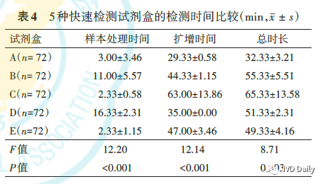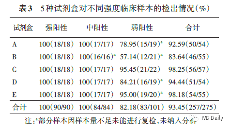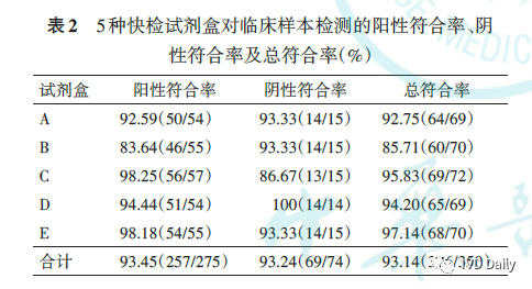 【摘要】目的对我国已批准上市的5种新型冠状病毒(2019⁃nCoV)核酸快速检测试剂进行多中心临床评价。 方法: 2020年11月在浙江大学医学院附属第一医院、华中科技大学同济医学院附属同济医院和中国疾病预防控制中心病毒病预防控制所3家机构选取共计57份确诊2019⁃nCoV感染者及15份非感染者的咽拭子样本,对获批上市的5种2019⁃nCoV核酸快速检测试剂进行检测,分析阳性符合率、阴性符合率、总符合率,并分析阳性强度与阳性符合率的关系,检测时间和复检率情况。 结果5种试剂盒阳性符合率为92.59%(50/54)、83.64%(46/55)、98.25%(56/57)、94.44%(51/54)和98.18%(54/55);阴性符合率为93.33%(14/15)、93.33%(14/15)、86.67%(13/15)、100%(14/14)和93.33%(14/15);总符合率为92.75%(64/69)、85.71%(60/70)、95.83%(69/72)、94.20%(65/69)和97.14%(68/70)。5种试剂盒对强阳性和中阳性标本的检出率均为100%(90/90、84/84),对循环阈值33 以上的弱阳性样本检出率为82.18%(83/101),2 种试剂盒的复检率高于10%,分别为15.28%(11/72)和12.50%(9/72)。5种试剂盒从提取到扩增检测所需平均总时长在32.33~65.33 min。 结论5种2019⁃nCoV核酸快速检测试剂盒性能均较好,可以作为常规核酸检测的补充。 材料:选取2022年11月在浙江大学医学院附属第一医院、华中科技大学同济医学院附属同济医院和中国疾病预防控制中心病毒病预防控制所确诊2019⁃nCoV 感染者及非感染者的咽拭子样本各24份,根据循环阈值(cycle threshold,Ct)的大小分为强阳性样本(Ct值≤28)、中阳性样本(28<Ct值≤33)和弱阳性样本(Ct值>33)。评价产品为我国批准上市的5种2019⁃nCoV核酸快速检测试剂盒(隐去名称,使用ABCDE标注)。 结果:5 种试剂盒对临床样本检测的阳性符合率、阴性符合率及总符合率样本盘结果比较,试剂盒C 阳性符合率最高,为98.25%,其次为试剂盒E、D和A,阳性符合率均超过90%,分别为98.18%、94.44%和92.59%,而试剂盒B 的阳性符合率低于90%,为83.64%。5种试剂盒阴性符合率从高到低依次为D(100%),A、B 和E(均为93.33%),C(86.67%)。5种试剂盒总符合率从高到低依次为E、C、D、A和B。 5 种试剂盒对不同强度临床样本的检出情况:5种试剂盒对强阳性和中等强度阳性样本的检出率均达到100%,但对于Ct值33以上的弱阳性标本,不同试剂盒的检出能力存在明显差异,试剂盒C和E的检出能力最强,均达到95%,其余3种试剂盒的检出能力均低于90%,分别为84.21%(D)、78.95%(A)和57.14%(B),5 种试剂盒对弱阳性样本的总体检出率为82.18%。 5种快速检测试剂盒检测时间比较:按照说明书在3 家机构评估5 种核酸快速检测试剂盒的样本平均处理时间和平均扩增时间。试剂盒A、C 和E 的样本平均处理时间较短,分别为(3.00±3.46)、(2.33±0.58)和(2.33±1.15)min,试剂盒D 的样本处理时间最长,为(16.33±2.31)min。平均扩增时间最短的试剂盒为试剂盒A,由短至长依次为D、B、E和C,差异有统计学意义(P 均<0.01)。5 种试剂盒从样本处理到扩增完成的平均总时长在32.33~65.33 min。 5种试剂盒的复检情况分析:3家机构按照试剂盒说明书的规则判断是否需要复检,对5种试剂盒的复检情况进行统计分析发现,试剂盒A 和B 的复检率高于10%,分别为15.28%(11/72)和12.50%(9/72),试剂盒C 复检率最低,为6.94%(5/72),试剂盒D和E的复检率分别为9.72%(7/72)和8.33%(6/72)。 讨论:5种核酸快速检测试剂盒对强阳性及中等强度阳性样本的符合率100%,但对弱阳性样本,筛查效果差异较大。国外研究报道同类产品的阳性符合率均不高,美国Mesa Biotech公司的Accula的阳性符合率仅为68.0%;美国雅培公司的ID Now的阳性符合率为78.8%,提示我国2019⁃nCoV快速检测试剂盒的阳性符合率总体上优于国外产品。本研究结果显示不同试剂盒的阳性符合率与PCR上样量无相关性,不同试剂盒阳性符合率差异较大的原因可能与试剂盒的检测技术原理不同,引物、探针设计和扩增体系存在差异有关,造成对弱阳性样本的检出能力不同。 总体而言,本研究结果提示我国批准的5种2019⁃nCoV核酸快速检测试剂盒总体性能较好,可以作为常规核酸检测的补充,在需快速获得检测结果、样本数量较少、实验室条件有限等情况下使用,有助于为疫情防控“四早”提供技术手段。 |