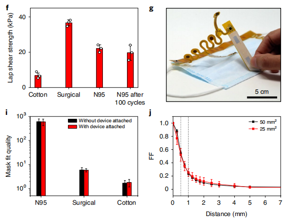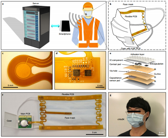 2019年新冠肺炎的出现以及世界各国政府随后推行的卫生政策突显了口罩在抗击传染病传播中的重要性。口罩长期以来一直用于医疗保健,但是,公共部门向佩戴口罩的过渡遇到了众所周知的合规性和有效性的挑战。特别是,许多人报告说口罩不舒服或令人窒息,这迫使他们摘下口罩以改善呼吸。然而,戴口罩只有在正确佩戴口罩并且紧紧覆盖面部时才有效。 面部特征的变化也会妨碍口罩的正确佩戴,尤其是对于女性、面部较小的年轻人和留胡子的男性。目前,口罩主要设计用于医院空调环境和胡子剃得干干净净的男性用户。这种受控的条件和环境是普通市民无法获得的。相反,为更广泛的公众设计更好的口罩需要更好地理解与口罩不合规相关的因素,以真实场景下用户的反馈和数据的形式收集,同时直接向用户提供实时贴合质量反馈也很有价值。 近日,来自美国的一个研究团队在杂志Nature electronics杂志上发表了一篇题为“A conformable sensory face mask for decoding biological and environmental signals”的文章。在这篇文章中,研究团队报道了一种可与商用面罩集成的适形多模态感官面罩(conformable multimodal sensory face mask, cMaSK),用于监测与传染病、环境条件和面罩佩戴状态相关的信号。设计包括实现低功耗操作的组件和固件,具有蓝牙低能耗的微处理器,以及与面罩集成的印制电路板(PCB)。薄粘合层允许集成系统与各种商用面罩(如外科口罩、N95口罩和棉口罩)反复粘合和分层。还开发了一个移动应用程序,通过蓝牙无线连接到cMaSK,并将数据传输到服务器进行数据存储和分析。 图片来源:Nature electronics 主要内容 cMaSK设计概述 下图显示了本研究的总体概念。cMaSK可以很容易地连接到各种面罩上,并且可以收集环境和生物信号。收集的数据通过蓝牙通信传输到定制的移动应用程序,并发送到服务器进行数据存储和管理。设计cMaSK时的四个要求:(1)应选择合适的传感器组件并将其放置在最佳位置;(2)cMaSK不应妨碍呼吸或影响面罩的佩戴和防护质量;(3)cMaSK应多次可逆地粘附在面罩上或从面罩上分离;(4)整个系统必须具有机械耐久性。 cMaSK由两部分组成:(1)f-PCB厚度为100 μm,与口罩进行交互;(2)控制整个设备操作的主PCB(m-PCB)。使用可充电锂电池,cMaSK可以运行超过60小时。 cMaSK设计概述。图片来源:Nature electronics 用cMaSK进行口罩贴合度测试 为了研究cMaSK对面罩性能的影响,研究团队使用了面罩贴合测试。结果显示了带有或不带有cMaSK的面罩的面罩贴合度(环境中和面罩内部的颗粒浓度之比),显示出几乎相同的值。这些数据表明,由于cMaSK的薄而适配的几何形状,它可以应用于各种类型的面罩,而不必担心面罩性能的恶化。 cMaSK的体外表征结果。图片来源:Nature electronics cMaSK的传感性能表征 cMaSK含有17个电容传感器。cMaSK可以通过电容传感器垫来检测口罩贴合度的变化。当面罩完全覆盖面部时,电容数值最高,因为当cMaSK完全覆盖鼻子和嘴时,接触皮肤的电容传感器垫最多。cMaSK还设置了空气压力传感器。当cMaSK完全覆盖时,因为呼吸运动,空气压力值有几十帕斯卡量级的波动。然而,当面罩未正确佩戴时,压力传感器无法检测到这种呼吸模式。另外,cMaSK不仅可以测量皮肤温度,还可以检测呼吸引起的温度和湿度变化以及各个方向上的加速度。 当cMaSK未正确佩戴时,呼吸引起的波动变得更弱,甚至消失(下图)。传感器表征结果验证了cMaSK可以基于这些多模态信号对面罩的佩戴位置进行分类。此外,通过计算温度、湿度和气压的波动次数,可以高精度地识别呼吸频率,甚至可以在说话时检测咳嗽。因此,研究团队验证了cMaSK可以监测与传染病相关的关键生物信号,如呼吸频率、咳嗽和皮肤温度。 cMaSK在不同面部位置和各种言语活动下的体内表征。图片来源:Nature electronics 体内环境和生物数据记录操作 使用cMaSK进行了体内人体试验,以验证在进行各种活动时记录生物和环境数据的适用性和可靠性。体内测试结果显示,根据cMaSK的位置,无论活动类型如何,每个传感器值都显示出明显的差异。cMaSK可以在动态活动期间测量皮肤温度(图e),使用加速度计监测人类活动,确定语言活动(呼吸频率、咳嗽和说话),即使受试者正在进行各种身体活动(图d、f)。 人体试验还表明,cMaSK不仅可以在各种活动中监测环境和生物信号,还可以评估面罩贴合质量。结果显示,因为面部尺寸和形状的差别,女性受试者的外科口罩的贴合质量不足,尤其是在口罩的底部和侧面区域,拟合质量分别比男性受试者低80%和70%。 人体实验身体活动分析。图片来源:Nature electronics 使用cMaSK验证口罩配合质量改进 男性受试者的胡子和女性受试者口罩尺寸不匹配导至口罩贴合度差,这显著影响了口罩的功效。对一名戴不同尺寸外科口罩的女性受试者以及一名剃须前后的男性受试者进行了口罩贴合度改善分析。结果显示,当外科口罩尺寸减小时,女性受试者的口罩贴合度测试仪测得的贴合度增加。这些结果强烈表明,较小的面罩更适合面部特征较小的人,如女性和儿童。男受试者剃胡子后,cMaSK测量的口罩贴合度在外科口罩和N95口罩中均增加。 通过对男性和女性受试者的口罩佩戴改善情况的分析,验证了cMaSK可以评估每个人的佩戴质量和空气面罩泄漏情况,其趋势与传统口罩佩戴测试仪得出的趋势相似。 总结和讨论 研究团队报告了一种可连接到任何面