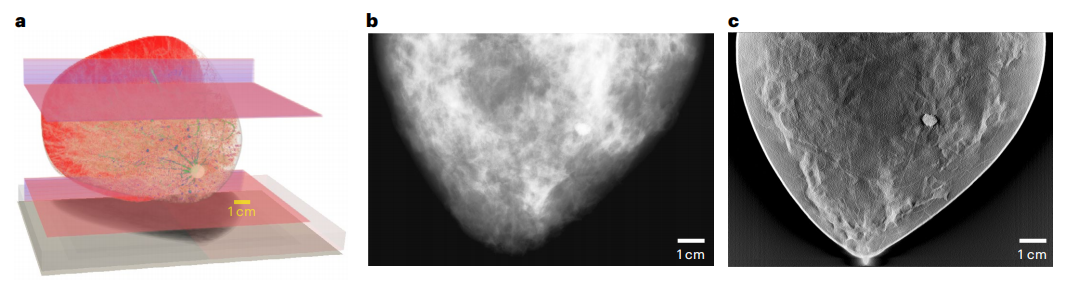 去年,美国食品和药物管理局(FDA)发布了一项行动计划,旨在进一步监督基于AI的医疗器械软件(SaMD)。需要多样化、高质量和经济高效的大数据集来优化从数据采集、图像重建和分析到诊断发现的整个工作流程。在实践中,获取大型临床数据集的成本很高。在这种情况下,上述虚拟扫描将是非常宝贵的。作为数字孪生技术价值概念的证明,FDA的一个团队模拟了监管评估虚拟成像临床试验(VICTRE)研究,其中创建了2986名虚拟患者,以评估数字乳腺体层合成(DBT)作为乳腺癌筛查全数字化乳腺摄影替代品的性能,如下图。研究表明,模拟工具可能是成像设备监管评估的可行证据来源。
