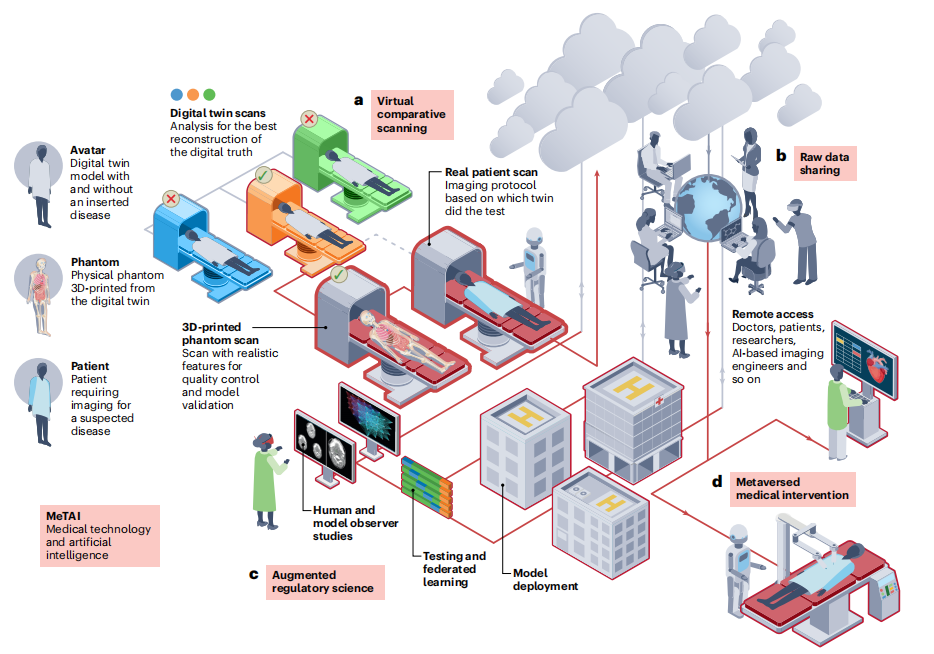 人体和机器的先进计算机模型的不断发展,最终形成了数字孪生计算范式,将物理和虚拟物体的数据集成。为了进一步利用这些创新进行医学成像,需要构建虚拟断层扫描仪,具有可由扫描仪解析的解剖特性的个体化计算化身,以及AI支持的图形工具,以插入、删除和修改这些化身中的疾病。此外,可以3D打印和扫描物理化身,以模拟真实扫描并改进相关模型和分析。MeTAI部署的XR相比孤立XR的一个优势是基于大规模协作的工作流可用性,从而可以公平地比较和完善各种品牌的硬件和软件,并在患者和专业人员之间进行生动和及时的交互。