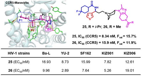 近期,中国科学院昆明动物研究所郑永唐研究员团队与中国科学院上海药物研究所柳红研究员团队合作研究,发现了一类结构新颖的CCR5拮抗剂。其中化合物25和26具有高效的CCR5拮抗活性,与马拉维诺相当。同时,化合物25和26对多种HIV-1毒株均具有高效的抑制活性,且具有较低的细胞毒性。化合物26与其它作用靶点的抗HIV-1药物(核苷类/非核苷类逆转录酶抑制剂、整合酶链转移抑制剂和融合抑制剂)联用呈现出显著的协同抗病毒效应。