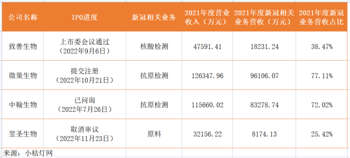 随着12月初防疫政策调整,各地纷纷取消了常态化核酸检测,公共场所也不再查验健康码、行程码,从之前的“应检尽检”到现在倡导“非必要不检测”,仿佛一夜之间,随处可见的核酸检测亭都消失了。 导 语 图源:中国新闻周刊 受新冠疫情影响,不少企业举步维艰,但口罩、新冠病毒检测等公司的利润却一飞冲天,业绩翻几倍、几十倍屡见不鲜。据统计,资本市场上,2021年有17家IVD企业在A股上市,分别为浩欧博、之江生物、易瑞生物、奥泰生物、科美诊断、诺禾致源、亚辉龙、睿昂基因、爱威科技、纳微科技、义翘神州、兰卫医学、禾信仪器、百普赛斯、诺唯赞、安旭生物和优宁维。2022年IPO排队/已上市的IVD企业也有近20家,分别为菲鹏生物、华大智造、艾迪康、英诺特、仁度生物、致善生物、微策生物、中翰生物、凯莱谱、丽珠试剂、美因基因、凯实生物、臻和科技、苏州雅睿、康为世纪、近岸蛋白、景杰生物、荣盛生物、翌圣生物等。 月前,不少媒体和投资者喊出“禁止核酸检测企业上市”。上交所和深交所也火速回应“高度关注,并从严审核科创属性和可持续经营能力”。与此同时,舆论对核酸检测企业的发酵达到了高潮。 那么,这些新冠检测相关企业还能顺利上市吗?经查询,IPO排队中的IVD企业仍有不少,如致善生物、微策生物已顺利过会,翌圣生物仍在等待上会,中翰生物还在问询中。