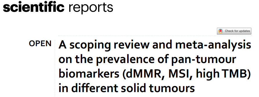近日,一组来自澳大利亚的研究团队在杂志Scientific reports上发表了一篇题为“A scoping review and meta-analysis on the prevalence of pan-tumour biomarkers (dMMR, MSI, high TMB) in different solid tumours”的文章。研究团队在在文章中对三种泛肿瘤生物标志物(dMMR、MSI、高TMB)在泛癌环境中的流行率进行了首次结构化综述,(1)提供报告这三种泛肿瘤生物标志物患病率的研究的更广泛概述;(2)根据癌症类型和癌症分期巩固证据。