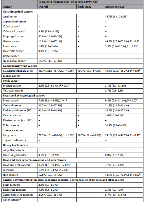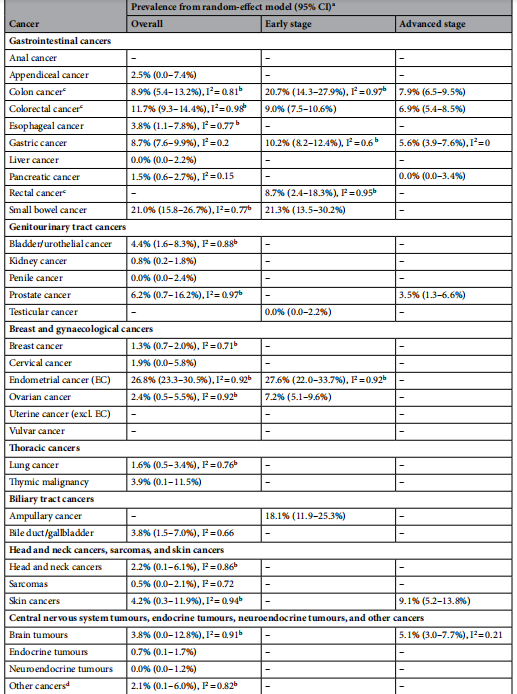 子宫内膜癌(26.8%)、小肠癌(21.0%)、结直肠癌(11.7%)、结肠癌(8.9%)和胃癌(8.7%)的dMMR总患病率较高。但对于子宫内膜癌以外的妇科癌症和其他癌症类型,总患病率通常较低(~ 5%)。胃肠道癌中dMMR的总患病率存在显著差异(范围:0.0–21.0%)。在有阶段特异性数据的情况下,dMMR肿瘤往往在早期疾病中被识别,如结肠癌、结直肠癌和胃癌。在癌症亚型中,dMMR的总患病率也存在显著差异,包括:(1)卵巢癌(子宫内膜样癌/非浆液性癌/粘液性癌11.8% VS卵巢癌2.4%);(2) 头颈部癌(口腔癌7.4% VS涎腺癌0.0%);和(3)皮肤癌(黑色素瘤6.7% VS 非黑色素瘤2.0%)。