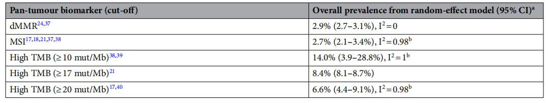 成人实体瘤中dMMR/MSI/高TMB的总体泛癌患病率。图片来源:Scientific reports