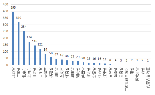 图14 代理人代理的进口医疗器械数量省份排位图 (六)境内第三类医疗器械省份分析 从2022年境内第三类医疗器械注册情况看,相关注册人主要集中在沿海经济较发达省份。 图15 境内第三类医疗器械注册省份排位图 其中,江苏、广东、北京、上海、浙江是境内第三类医疗器械首次注册数量排前五名的省份,占2022年境内第三类医疗器械首次注册数量的69.7%,与2021年相比增加1.8%。 四、创新医疗器械等产品注册审批情况 2022年,国家药监局按照《创新医疗器械特别审查程序》《医疗器械优先审批程序》继续做好相关产品的审查工作,共收到创新医疗器械特别审批申请343项,比2021年增加37.8%,其中68项获准进入创新医疗器械特别审查程序。 从2014年至2022年,国家药监局共批准189个创新医疗器械。其中,境内创新医疗器械涉及15个省的134家企业,进口创新医疗器械涉及2个国家的8个企业。 北京、上海、广东、江苏、浙江创新医疗器械获批产品数量和相应企业数量最多,约占全部已批准的189个创新医疗器械的82.5%。