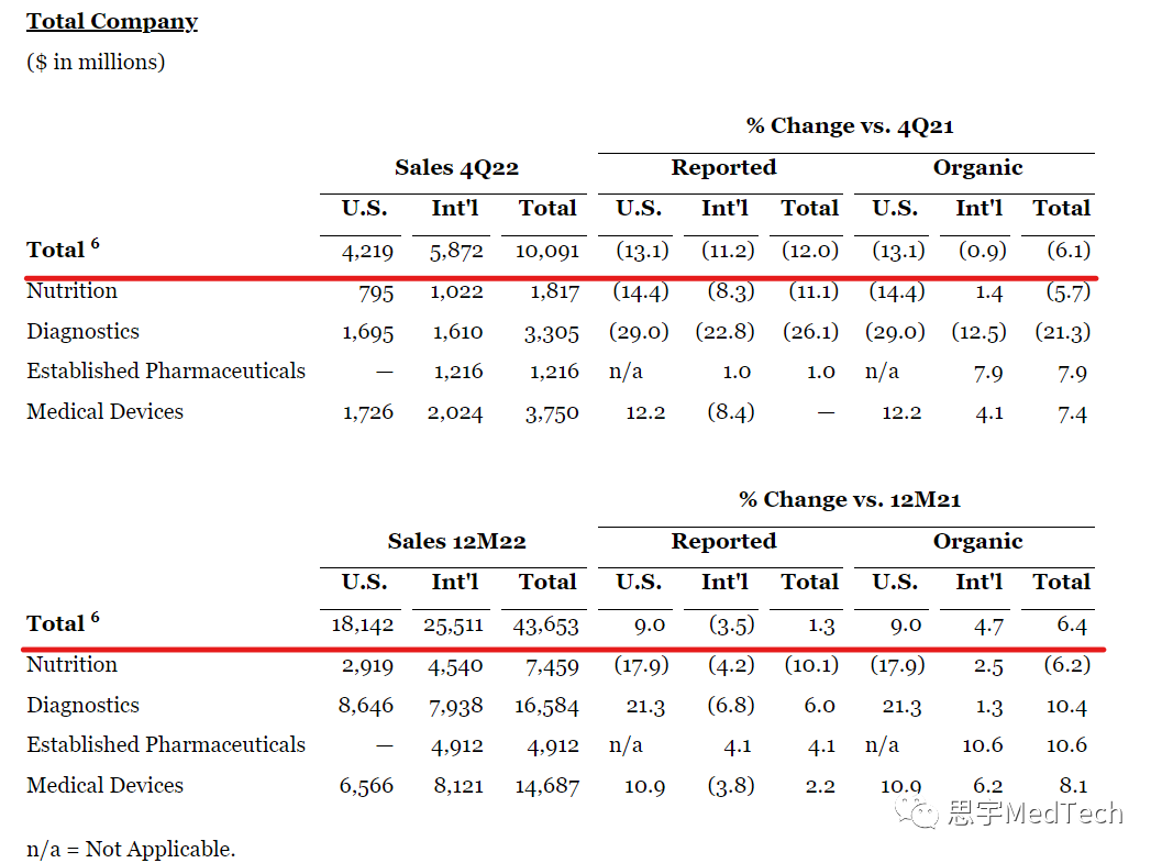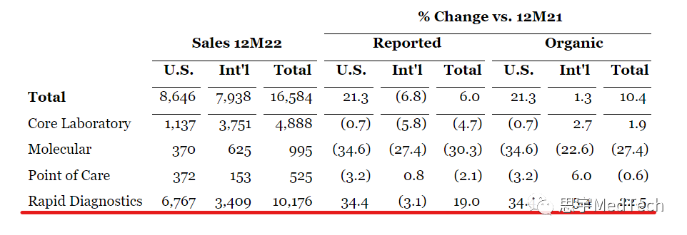 转载要求:请在文首标明文章来源,可直接转载 思宇MedTech 2023年1月25日,雅培(纽约证券交易所代码:ABT)公告了其第四季度业绩:雅培2022年全年营收437亿美元,同比+1.3%;有机增长+6.4%。 其中,诊断业务收入165.84亿美元、医疗器械收入146.87亿美元。 (雅培 Abbott公司商标) 2023年1月25日,雅培公布2022全年公司报告收入437亿美元,有机销售额增长6.4%。四大业务收入分别为:诊断165.84亿美元、医疗器械146.87亿美元、营养74.59亿美元、成熟药品49.12亿美元。 ▲雅培Q4和2022各业务营收情况(单位:百万美元,图片来自官网) 诊断业务是雅培的第一大业务,2022年全年营收占集团总营收的38%,达到165.84亿美元,同比+6%。诊断产品在第四季度的销售受到了新冠肺炎测试相关销售额同比下降的负面影响。从细分业务上看,增长主要由快速诊断(Rapid Diagnostics)+19%的高增长所驱动。从区域上看,主要由美国市场高达+21.3%的增长所驱动,国际市场营收下滑-6.8%。 2022内年市场释放了大量消极的信号,雅培在 2022 年伊始就不断面对诊断销售下降的预测。但实际与 COVID 相关的销售额接近 84 亿美元,相比 2021 年的 77 亿美元增长了 9%。 (雅培诊断营收数据(单位:百万美元)) 医疗器械业务是雅培的第二大业务,业务大致可以分为心血管领域医疗器械(节律管理、电生理、心衰、心血管、结构性心脏病)、神经调节、糖尿病护理三大领域。2022年医疗器械全年营收达到146.87亿美元,占集团总营收的34%,同比增长2.2%。 第四季度,医疗器械全球销售额与报告持平,有机增长7.4%。电生理、结构心脏和糖尿病护理领域的两位数强劲增长带动了美国的销售额增长。在国际上,销售增长受到中国间歇性新冠肺炎限制以及某些领域(包括电生理学和糖尿病护理)供应限制的负面影响。 雅培医疗器械组成如下: 心血管领域医疗器械:2022年收入91.61亿美元,包括: 节律管理21.19亿美元,电生理19.27亿美元,心衰9.2亿美元,血管24.83亿美元,结构性心脏病17.12亿美元。其中,结构性心脏病业务营收+6.3%,心衰业务营收+3.5%,电生理业务+1.1%,引领增长;节律管理业务营收下滑(-3.6%),心血管业务下滑(-6.4%)。 神经调节,2022年收入7.7亿美元; 糖尿病护理,2022年收入47.56亿美元。糖尿病设备是雅培最大、增长最快的医疗器械细分领域,其中大部分营收来自雅培Freestyle Libre连续血糖监测仪,其在第四季度的销售额约为11亿美元,其中美国增长超过40%。 2022年,雅培继续加强了其医疗器械产品组合,取得了多项最新进展,包括美国FDA的如下批准: