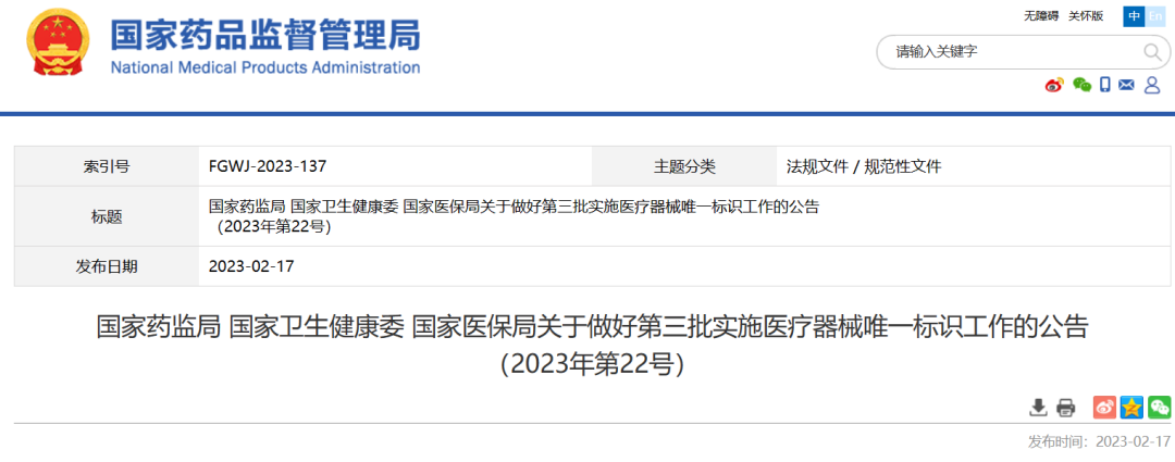 2021年1月1日,9大类69种第三类医疗器械第一批实施医疗器械唯一标识。2022年6月1日,其他第三类医疗器械(含体外诊断试剂)第二批实施医疗器械唯一标识。为进一步贯彻落实《医疗器械监督管理条例》《国务院办公厅关于印发治理高值医用耗材改革方案的通知》和国务院深化医药卫生体制改革有关重点工作任务,决定将部分第二类医疗器械作为第三批品种实施医疗器械唯一标识,现就有关事项公告如下: 一、品种范围 按照风险程度和监管需要,确定部分临床需求量较大的一次性使用产品、集中带量采购中选产品、医疗美容相关产品等部分第二类医疗器械作为第三批医疗器械唯一标识实施品种,具体产品目录见附件。 成为合规宝会员,海量资料随心下。千条法规随意查!还有更多功能等你来体验! 二、进度安排 对列入第三批实施产品目录的医疗器械,注册人应当按照时限要求有序开展以下工作: (一)唯一标识赋码 2024年6月1日起生产的医疗器械应当具有医疗器械唯一标识;此前已生产的第三批实施唯一标识的产品可不具有唯一标识。生产日期以医疗器械标签为准。 (二)唯一标识注册系统提交 2024年6月1日起申请注册的,注册申请人应当在注册管理系统中提交其产品最小销售单元的产品标识;2024年6月1日前已受理或者获准注册的,注册人应当在产品延续注册或者变更注册时,在注册管理系统中提交其产品最小销售单元的产品标识。 产品标识不属于注册审查事项,产品标识的单独变化不属于注册变更范畴。 (三)唯一标识数据库提交 2024年6月1日起生产的医疗器械,在其上市销售前,注册人应当按照相关标准或者规范要求将最小销售单元、更高级别包装的产品标识和相关数据上传至医疗器械唯一标识数据库,确保数据真实、准确、完整、可追溯。对于已在国家医保局医保医用耗材分类与代码数据库中维护信息的医疗器械,要在唯一标识数据库中补充完善医保医用耗材分类与代码字段,同时在医保医用耗材分类与代码数据库维护中完善医疗器械唯一标识相关信息,并确认与医疗器械唯一标识数据库数据的一致性。 当医疗器械最小销售单元产品标识相关数据发生变化时,注册人应当在产品上市销售前,在医疗器械唯一标识数据库中进行变更,实现数据更新。医疗器械最小销售单元产品标识变化时,应当按照新增产品标识在医疗器械唯一标识数据库上传数据。 三、有关要求 医疗器械注册人要切实落实主体责任,鼓励基于唯一标识建立健全追溯体系,做好产品召回、追踪追溯等有关工作。对于因《医疗器械分类目录》动态调整导至产品管理类别发生变化的情况,医疗器械注册人应当按照调整后管理类别的要求实施唯一标识。 医疗器械经营企业要在经营活动中积极应用唯一标识,做好带码入库、出库,实现产品在流通环节可追溯。 医疗机构要在临床使用、支付收费、结算报销等临床实践中积极应用唯一标识,做好全程带码记录,实现产品在临床环节可追溯。 发码机构要制定针对本机构的唯一标识编制标准及指南,指导医疗器械注册人开展唯一标识创建、赋码工作,并验证按照其标准编制的唯一标识在流通、使用环节可识读性。 省级药品监督管理部门要加强唯一标识工作的培训指导,结合实施工作推进需求做好产品注册系统改造,组织辖区内医疗器械注册人按要求开展产品赋码、数据上传和维护工作,加强与辖区内卫生、医保部门协同,推动三医联动。 省级卫生健康部门要指导辖区内医疗机构积极应用唯一标识,加强医疗器械在临床应用中的规范管理。 省级医保部门要加强医保医用耗材分类与代码与医疗器械唯一标识的关联使用,推动目录准入、支付管理、带量招标等的透明化、智能化。 特此公告。 【著作权声明】本文由CMDRA整理,其中引用了政府公开信息,转载请注明作者为CMDRA微信订阅号。 |