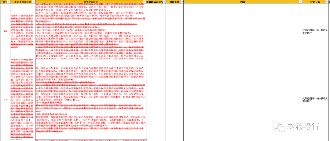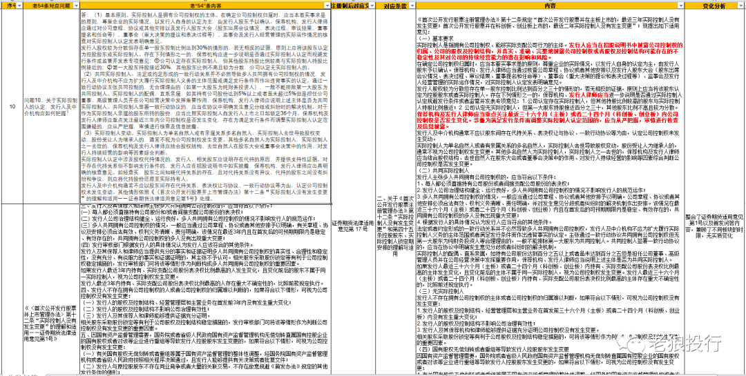 【前言】对投行从业者来说,老“54”条实在太过深入人心,非常有必要以老“54”条为准绳,逐条对比其中的差异,并将简化及删除的内容具体糅合到其他文件的出处也做个详细地阐述。本次修订,也体现了一些目前的审核重点: (1)紧跟注册制强调信息披露、强调针对性和重要性原则的原则,三大板块的规则进行了更新整合,部分较老的监管问答进行了与时俱进的修订; (2)整体的内容较原先进行了精简,部分简单重复或会计准则规定较为明确的简单问答内容进行了删除,如原问答27关于建筑企业工程施工的问题、问答29关于存货减值的问题等;部分已有相关文件规定的内容也进行了删除,如问题36关于主营业务3年内未变更的要求,实质已在《证券期货法律适用意见第3号》中进行了规定; (3)细化了经销业务核查的具体要求,新增的文字篇幅较大; (4)对一些财务处理实务中不够明确的问题进行了细化,比如股份支付的确认、等待期问题等。希望作者此文能对各位看官有所助益,不胜欢喜。 |