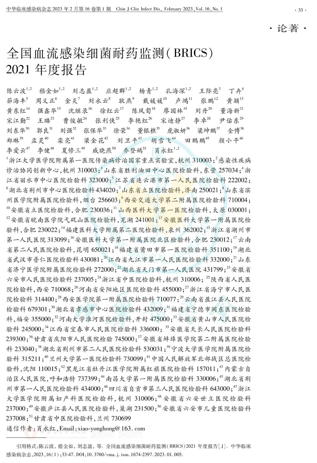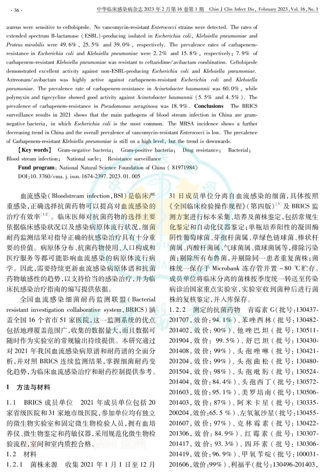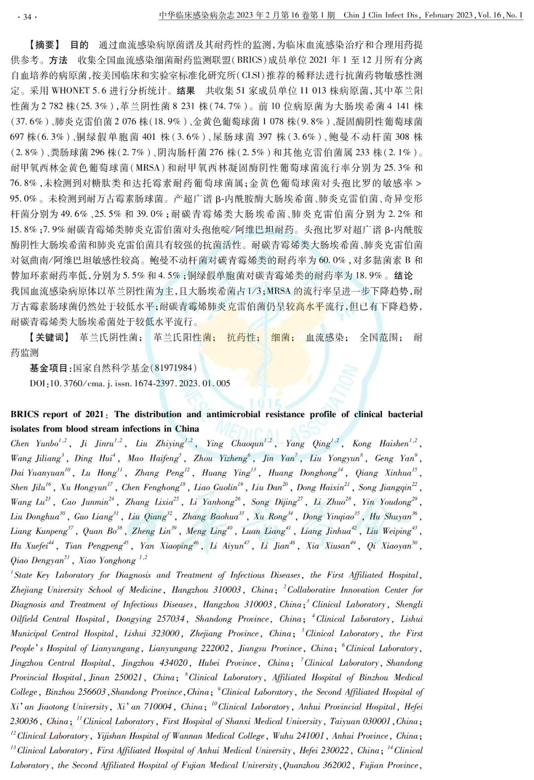 2021年度全国血流感染细菌耐药监测(BRICS)报告正式发表在《中华临床感染病杂志》 ...