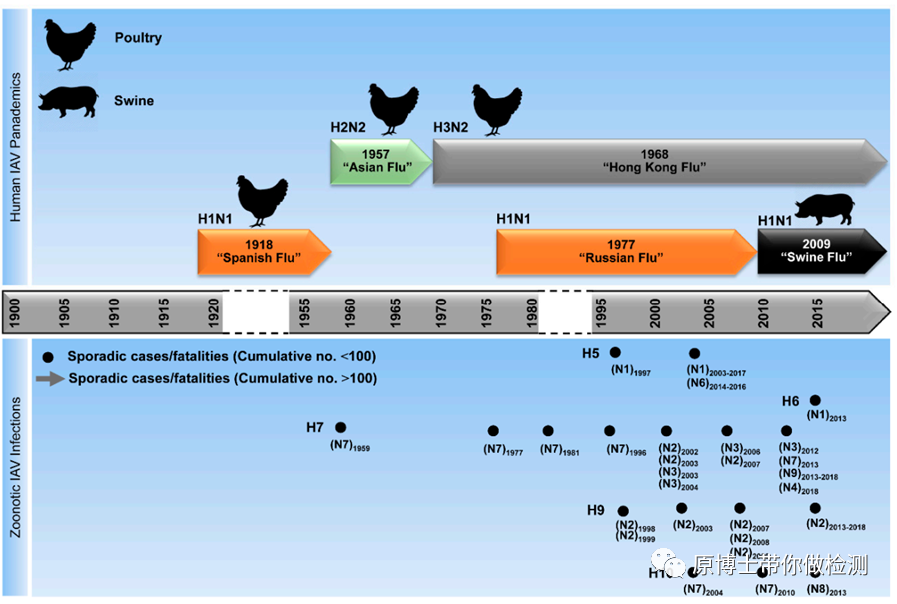 20世纪人类历史上几次大的流感病毒流行有2次与H1N1相关,比如1918年的西班牙流感是由禽传染到人的H1N1病毒引起,2009年的流感则由猪传染到人的H1N1病毒引起。