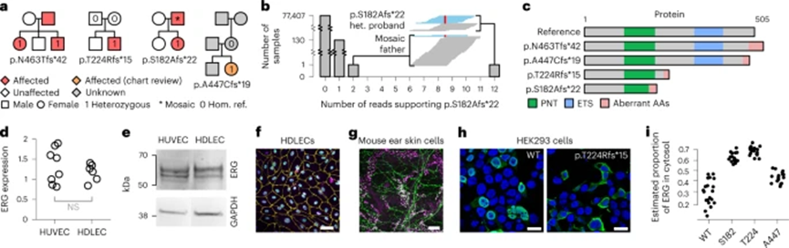 原发性淋巴水肿是一种罕见的疾病,其特征是淋巴管发育异常或功能障碍,导至淋巴液在组织中堆积,引起水肿和其他相关症状。ERG编码转录因子,这种转录因子在正常情况下对淋巴管发育和功能起着重要的调控作用。如果ERG发生功能丧失突变,则可能会影响淋巴管的正常发育和功能,导至淋巴液不能正常流动,从而引起原发性淋巴水肿。BeviMed发现ERG基因中高影响突变与特定疾病“原发性淋巴水肿”具有显著的遗传关联。三个高PPA的变异负责该遗传关联,它们的位置范围从Ensembl转录本ENST00000288319.12的密码子182到463。其中一个患者的父母有两个无变异等位基因,表明该截短杂合变异是新生突变。第四个家庭的参与者在100KGP中注册时,因其他疾病而被收集数据,但在手动检查数据时,发现该参与者除了已知疾病特征外,还有与原发性淋巴水肿相关的特征,这提供了在探索队列中的内部验证。先证者的父亲为嵌合体。ERG在淋巴内皮细胞核中的高表达水平,与淋巴管生成期间的转录调控功能相一致。此外,在原发性淋巴水肿病例中,缺陷的淋巴管生成可能是由于ERG的可用性减少(由于无义介导的降解或错误定位)而导至的。Erythroblast Transformation Specific(ETS)家族转录因子编码基因ERG的功能丧失突变导至原发性淋巴水肿。 图1 ERG中的功能丧失变异是原发性淋巴水肿的原因(图源:[1])