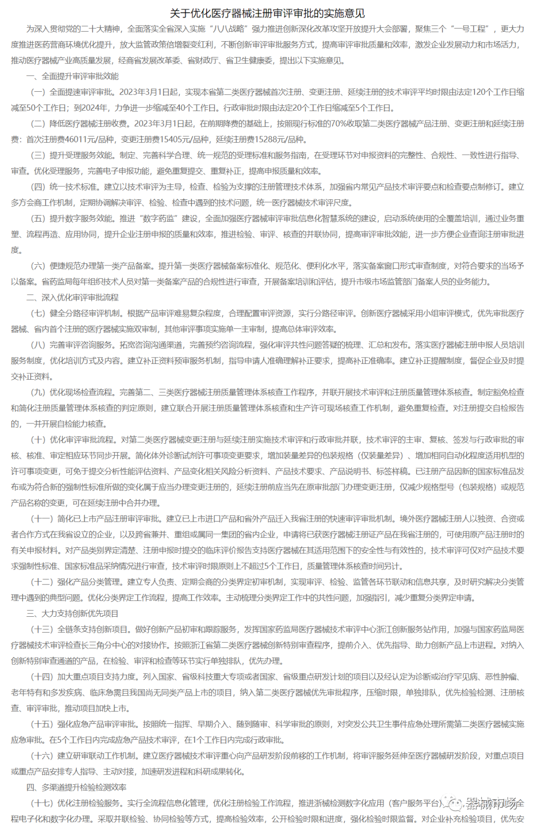 《实施意见》提出从2023年3月1日起,浙江第二类医疗器械首次注册、变更注册、延续注册的技术审评平均时限由法定120个工作日缩减至50个工作日;到2024年,力争进一步缩减至40个工作日;同时行政审批时限由法定20个工作日压缩至5个工作日。在前期两次降费的基础上,《实施意见》按照现行标准的70%收取医疗器械产品注册、变更注册和延续注册费,首次注册费46011元/品种,变更注册费15405元/品种,延续注册费15288元/品种,也就是首次注册费为2016年初始规定收费标准的49%,变更注册费和延续注册费为2016初始规定收费标准的39.2%。 值得一提的是,《实施意见》还提出符合创新医疗器械特别审批、优先审批、应急审批等条件的产品,可开辟绿色通道,强化指导服务,意味着浙江“高精尖”医疗器械项目能迅速上市满足临床需求,抢占市场先机。按照《医疗器械监督管理条例》,医疗器械是指直接或者间接用于人体的仪器、设备、器具、体外诊断试剂及校准物、材料以及其他类似或者相关的物品。(产品注册/备案是医疗器械生命周期中的重要环节,产品注册证是医疗器械产品的上市销售许可证明,只有成功获得注册证的医疗器械产品,才能在中国境内合法销售。因此,医疗器械的注册审评审批,是想要进入行业或已经进入的医械企业必须了解的内容,具体内容可点击:收藏!医疗器械注册和备案大全了解) 据报道,《实施意见》自3月1日正式实施以来,20天内该省共受理医疗器械产品首次注册73个、延续注册23个、变更注册17个,共计减免注册费用超过170万元。一直以来,浙江高度重视生物医药产业(含医疗器械)发展,将其列为建设三大科创高地和培育战略性新兴产业、十大标志性产业链、先进制造业集群的重要内容。或许此次通过出台《实施意见》,浙江省可着力推动医疗器械审评审批速度和注册收费水平明显优于长三角区域等产业发达省市,在市场上快速抢占先机。当然,浙江省药监局相关负责人表示,医疗器械产品质量事关公众健康与生命安全,目前采取的优化举措绝不意味着降低审评审批要求,忽视产品安全性和有效性。“我们将持续把好医疗器械产品准入关,持续强化医疗器械上市后监管,以高水平安全助力产业高质量发展。”此外,2023年3月17日,广东省药监局发布的《2022年度广东省医疗器械注册工作报告》中显示,得益于2022年广东省药监局印发的《关于优化第二类医疗器械注册审评审批的若干措施》,提出优化审评服务,健全分路径审评机制,优化现场检查流程,统一技术审评标准,细化配套措施等二十条举措,配套出台《关于已上市第二类医疗器械迁入我省注册申报指引(试行)》《第二类医疗器械(体外诊断试剂)注册证核发事项受理审查要求》《关于实施医疗器械主文档登记事项的通告》《关于医疗器械检验的工作指引》《优检十二条》等制度,全面加快了广东省第二类医疗器械上市审批进程。可以看出,为了帮助医疗器械产业进一步摆脱“低小散”局面;同时进一步鼓励支持创新,有利于“高精尖”医疗器械项目的快速获批,满足临床需求,多个省份正在同时探索医疗器械审评审批政策优化,门槛的降低无疑是对于医疗器械行业的重大利好。附:浙江省《关于优化医疗器械注册审评审批的实施意见》全文